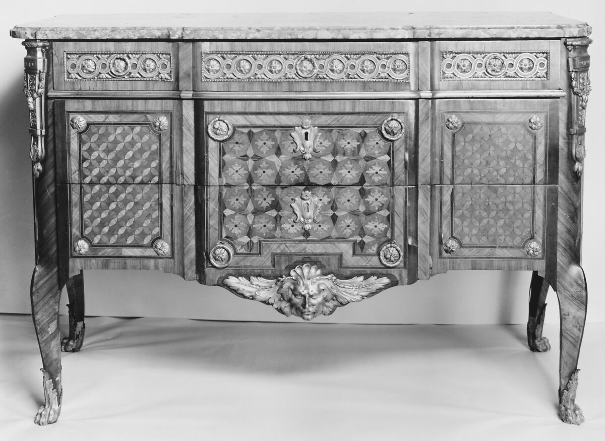 The change from the light and elegant Rococo style, characterized by curving lines and the use of naturalistic motifs, to the more restrained and architectural Neo-Classicism, influenced by classical antiquity, did not happen overnight. In fact, the 1760s were a time of transition during which the cabinetmakers generally adopted the new classical decoration before changing the overall shape of their pieces. This transitional breakfront commode or chest of drawers, which does not bear a maker’s mark, illustrates this very clearly. Although the piece is still supported on gently curving cabriole legs, the gilt-bronze mounts show a preference for Greek and Roman architectural motifs. Rather than with floral marquetry, the exterior surface is decorated with a repetitive geometrical pattern known as parquetry. The various woods are placed in such a way to create not only a striking contrast in color but also in the direction of the grain.