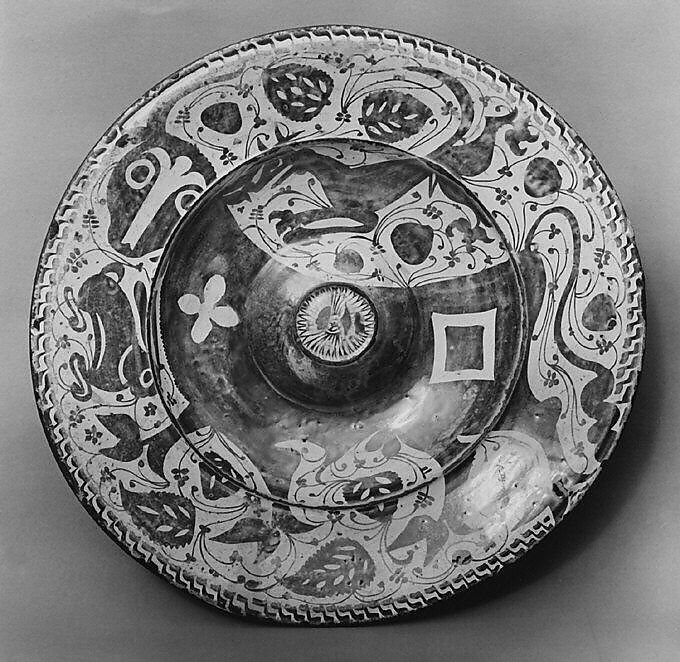 Tin-glazed earthenware, of which lusterware is one type, was developed in the Middle East in the ninth and tenth centuries to imitate the porcelains produced in China. The opaque white glaze concealed the clay body, which could range from pale buff to brick red, allowing for brilliant effects created by painting the white surface with metal oxides that fired to a range of colors. This technique, as well as the use of metallic luster—an iridescent, coppery painted glaze—spread throughout the Muslim world, arriving among the potters of Valencia in the thirteenth century. The so-called Hispano-Moresque lusterware, with its fusion of Islamic and Gothic styles and motifs, often in shaped imitating those of metal vessels, was treasured by the elite in Spain during the fifteenth century and exported to the courts of Europe. The Valencian industry declined in the late sixteenth century, as colorful Italian Renaissance maiolica gained in popularity among the fashionable and as Spanish centers were founded to produce versions of its pictorial forms. Adding to this decline was the expulsion from Valencia in 1609 of all the remaining Moriscos (Muslims converted to Christianity), though Christian potters reestablished the industry shortly thereafter.