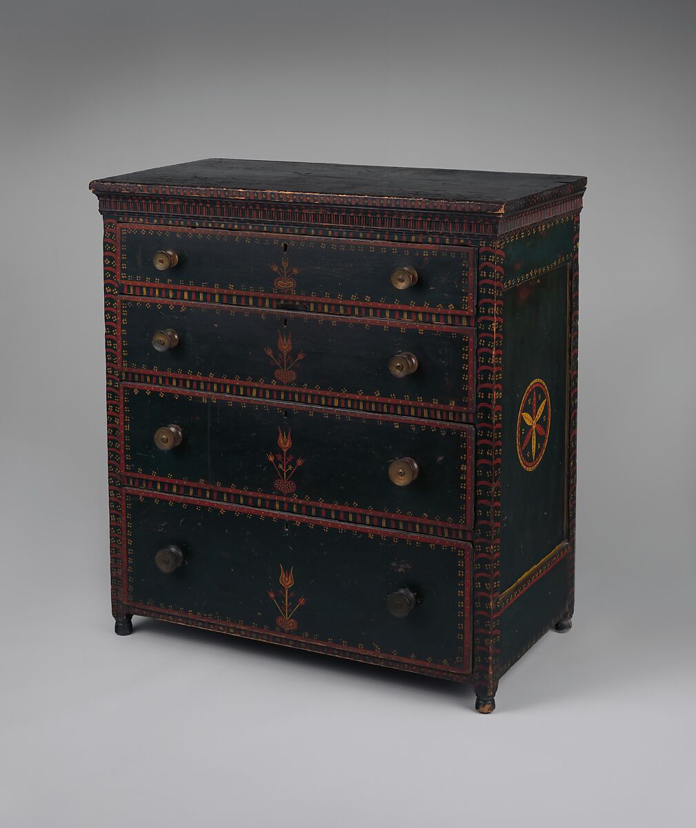 The green background and the red and yellow ornamental borders are characteristic of painted furniture from the Schwaben Creek Valley in Schuylkill County, Pennsylvania. A recent study for the Pennsylvania German Society has determined this chest’s decoration to be unique.