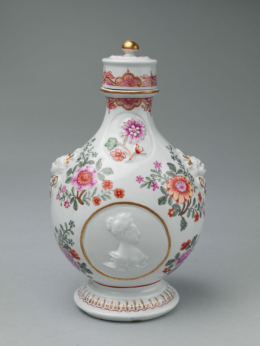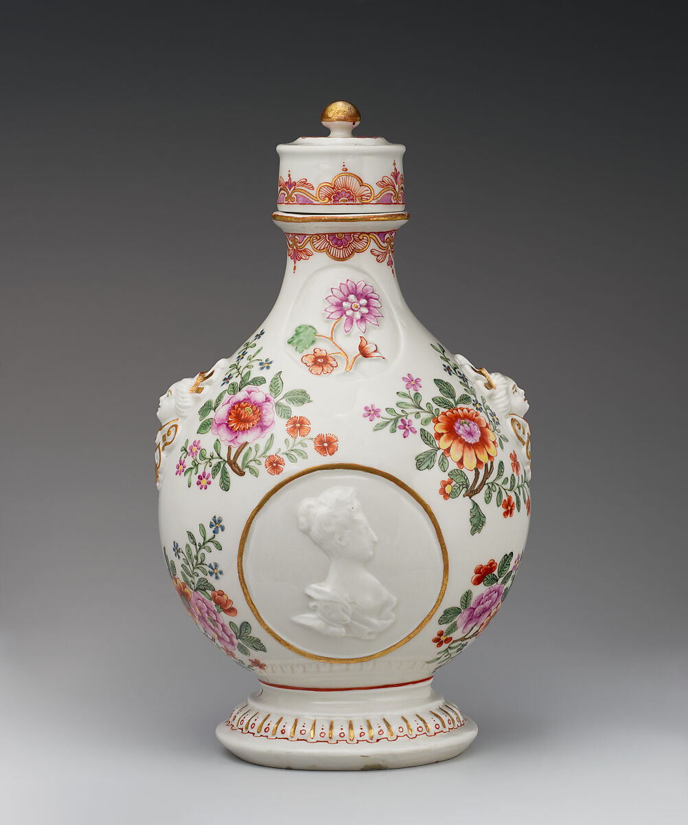 This bottle is decorated with low-relief portraits of the Habsburg Emperor Charles VI (1685–1740) and Empress Elizabeth (1691–1750), rulers of Austria.