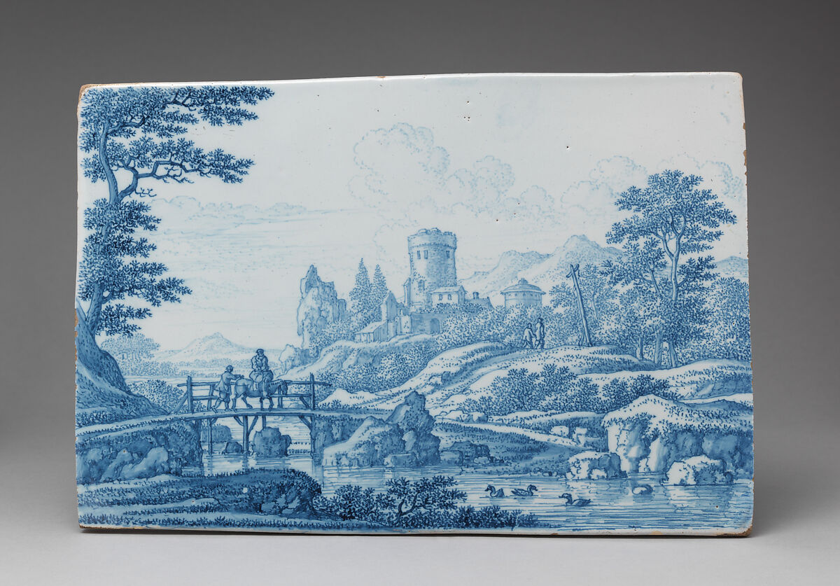 Trained as a painter, Van Frytom is foremost known today for his exquisite blue monochrome depictions of landscapes on faience plaques which were meant to be framed and hung on the wall. On this plaque, the mountainous landscape with travelers on a bridge is an imaginary or Italianate landscape. Not known to have ever left the country, Van Frytom may have derived inspiration for this scene from work by artists who traveled to Italy, such as the popular compositions by Nicolaes Berchem (1620–1683). Other compositions show typically Dutch scenes, such as the view of the river with village (50.211.40).