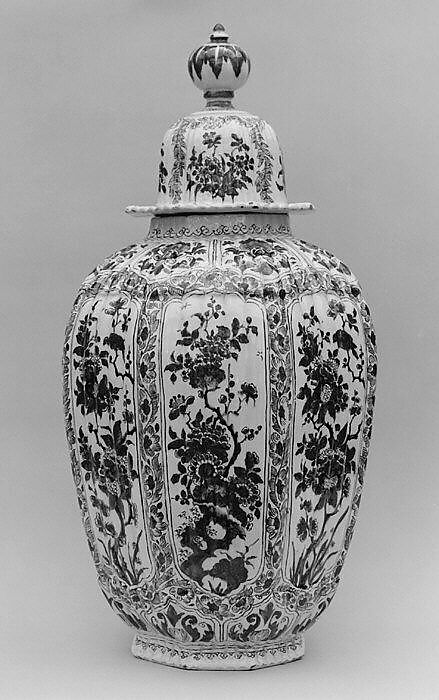 The shape and decoration are modeled after imported Chinese porcelains. Large Dutch vases and their Chinese prototypes were admired in England and remained part of formal interior furnishings for over a century.