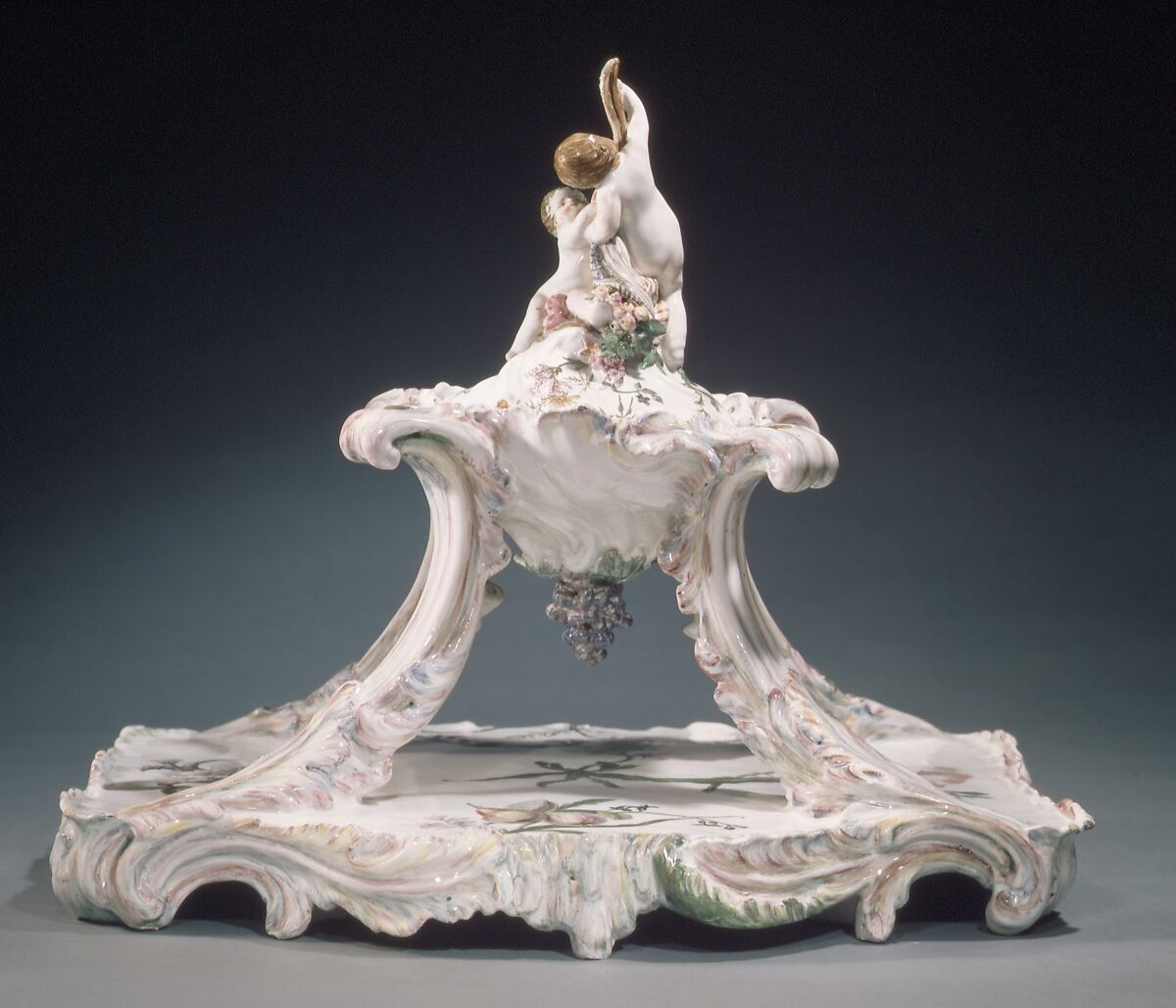 Faience, or tin-glazed and enameled earthenware, first emerged in France during the sixteenth century, reaching widespread usage among elite patrons during the seventeenth and early eighteenth centuries, prior to the establishment of soft-paste porcelain factories. Although characterized as more provincial in style than porcelain, French faience was used at the court of Louis XIV as part of elaborate meals and displays, with large-scale vessels incorporated into the Baroque garden designs of Versailles. Earlier examples of French faience attest to the strong influence of maiolica artists from Italy. Later works demonstrate the ways in which cities such as Nevers, Rouen, Lyon, Moustiers, and Marseille developed innovative vessel shapes and decorative motifs prized among collectors throughout Europe.