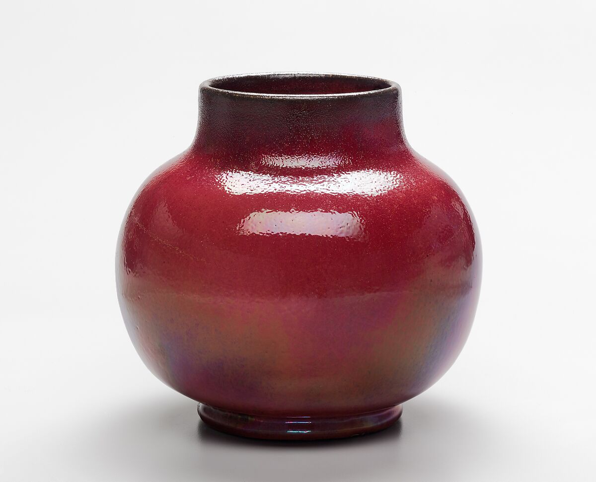 Robertson preferred some of his copper-red glazes over others. In an 1889 letter to Allan Marquand, a distinguished Princeton professor who had a special interest in ceramics, Robertson singled out his "Orange peel Blood as far superior to the smooth," commenting that it was "not so common" and "gives a richer and more varied effect." The richness that Robertson observed is seen on this squat, spherical vase with a subtly pitted texture that indeed resembles the skin of an orange, a characteristic of some Chinese glazes.