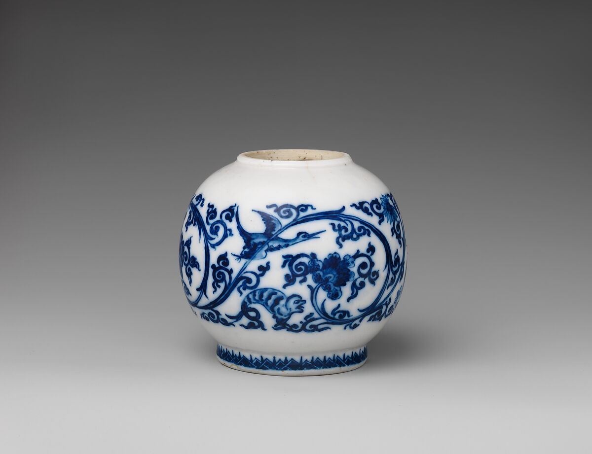 This small globular vase is the surviving bottom half of what was known as a double gourd vase. It dates from the earliest years of the Saint-Cloud manufactory, the first in France to produce artificial or soft-paste porcelain commercially. The decoration in cobalt blue reflects the influence of imported Chinese porcelains, but the designs of arabesques and fantastic creatures is French in origin.
