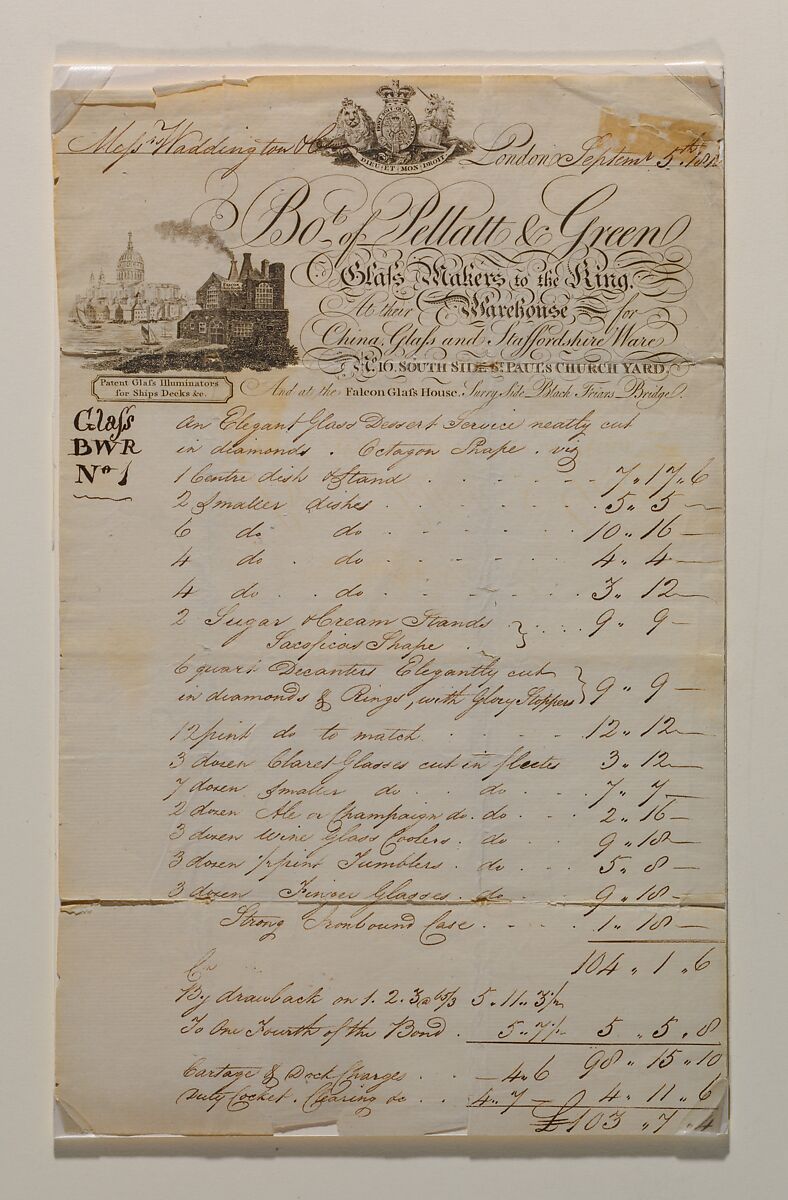 This is the original bill of sale for a table service (2008.594.1-.53) William Bayard (1761–1826) commissioned in 1818 for his daughter Harriet (1799–1875) and her husband Stephen Van Rensselaer IV (1789–1868) from Pellatt & Green, London’s premier glasshouse. The fine lead glass and deep Regency cutting would have created a brilliant sparkle in their candlelit dining room, in Albany, New York. The set originally included dozens of drinking glasses, for claret, ale, and champagne, as well as decanters, wine coolers, tumblers, and finger glasses, all “elegantly cut in diamonds & Rings” according to the document. In addition to its elegance and quality, the service is extremely rare in it’s documentation to the specific American family who owned it and to the English glasshouse that made it.