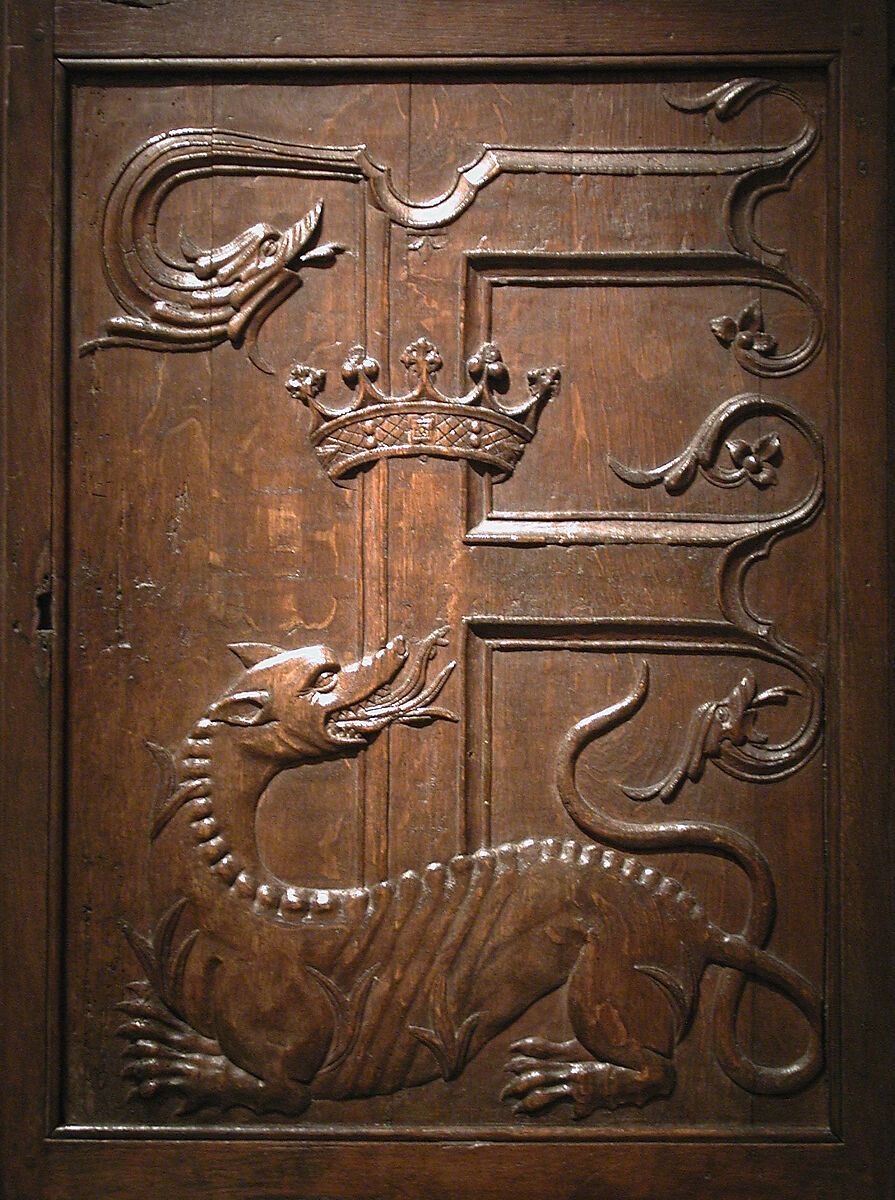 The crown, initial F, and salamander engulfed in flames are emblematic of François I, who reigned from 1515 to 1547. Considered impervious to fire, the salamander symbolized the king’s constancy and integrity as a ruler. Carved in wood or stone, variations on this device figured prominently in the decoration of François’s châteaux, including Fontainebleau and Chambord.