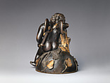 Leaning against the stump of a tree, his body cushioned by a lionskin, Cupid sits astride a hemispheric orb decorated with foliage. The figure is asleep, and his heavy head rests on his right arm, his closed eyelids dotting a peaceful mien. Still, an alertness belies Cupid’s restful pose. His back is erect, and his left hand grasps a shell. He wears his quiver, and his wings appear at the ready. Gilding adorns several elements of the composition: the leaves, the undone bow, the tree stump, the quiver, and the shell.