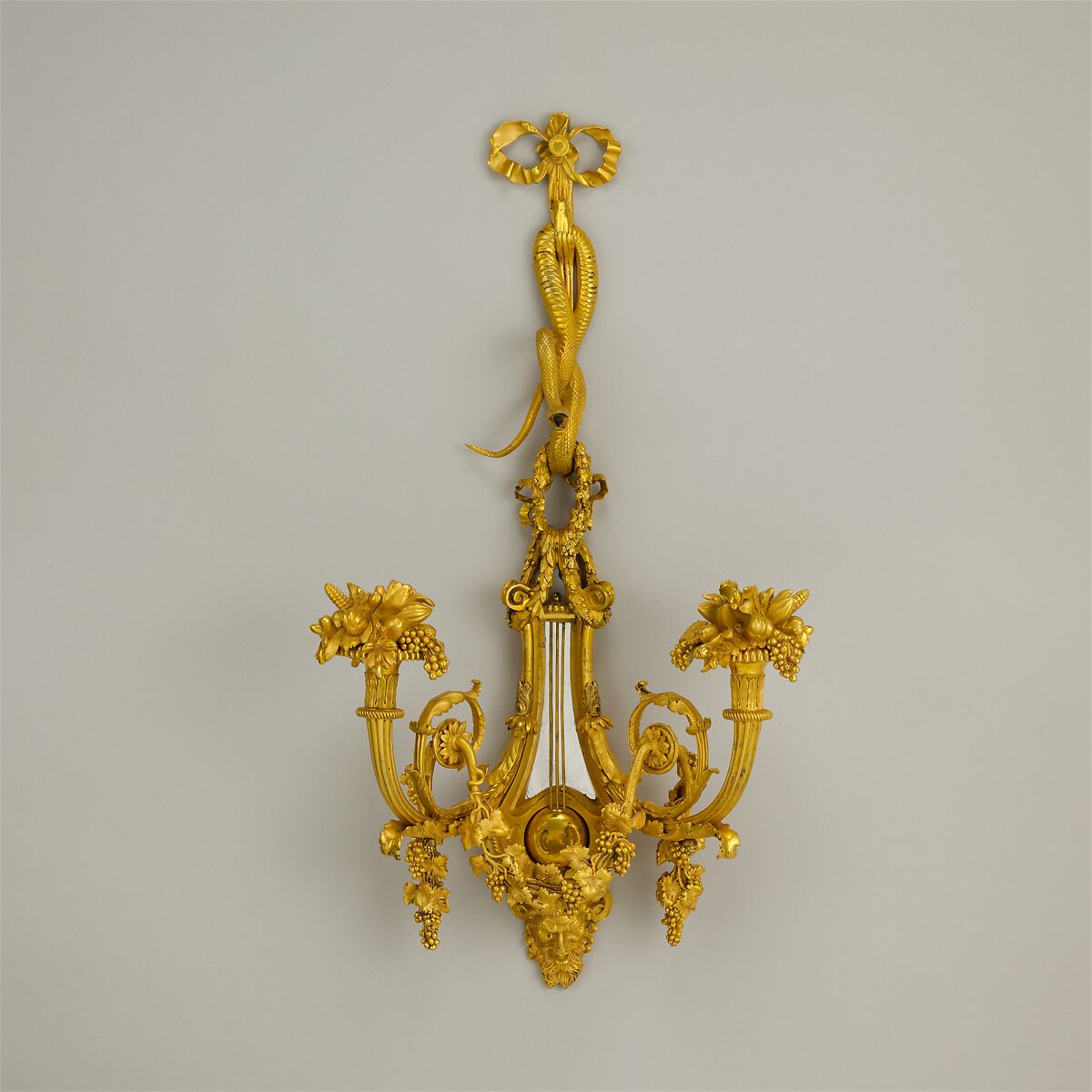 Suspended from a gilt-bronze ribbon tied in a bow knot, an intertwined snake holds a garland of leaves supporting a lyre-shaped backplate, while a pan flute, tambourine and thyrsus are suspended on a ribbon below a satyr mask. The decoration clearly alludes to Bacchus, the Roman god of wine and revelry: thus music is combined with merry-making. The two arms are shaped as cornucopias with scrolls and garlands of vine leaves and grapes, their candle dishes piled with fruit.