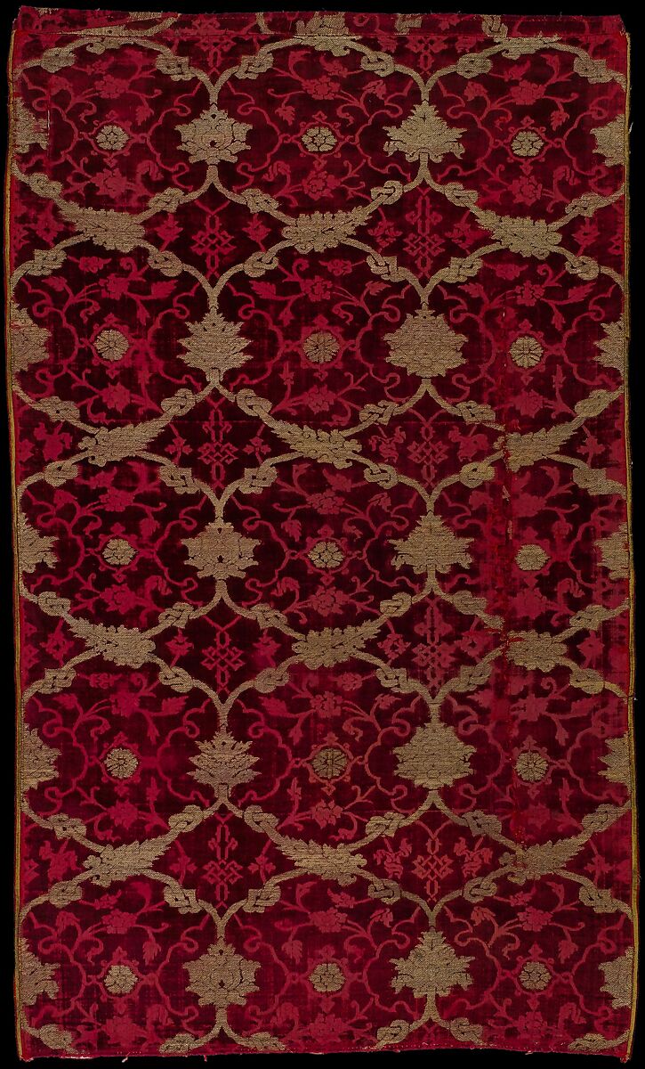 This splendid crimson velvet with pink voided areas and others brocaded with silver-wrapped yellow thread reflects the international style common in Turkey, Iran, Syria, and Egypt in the late fifteenth century. Yet, because of the mutual exchange of artistic vocabularies, especially in the production of velvets, there remains the possibility that this textile was actually woven in Venice.