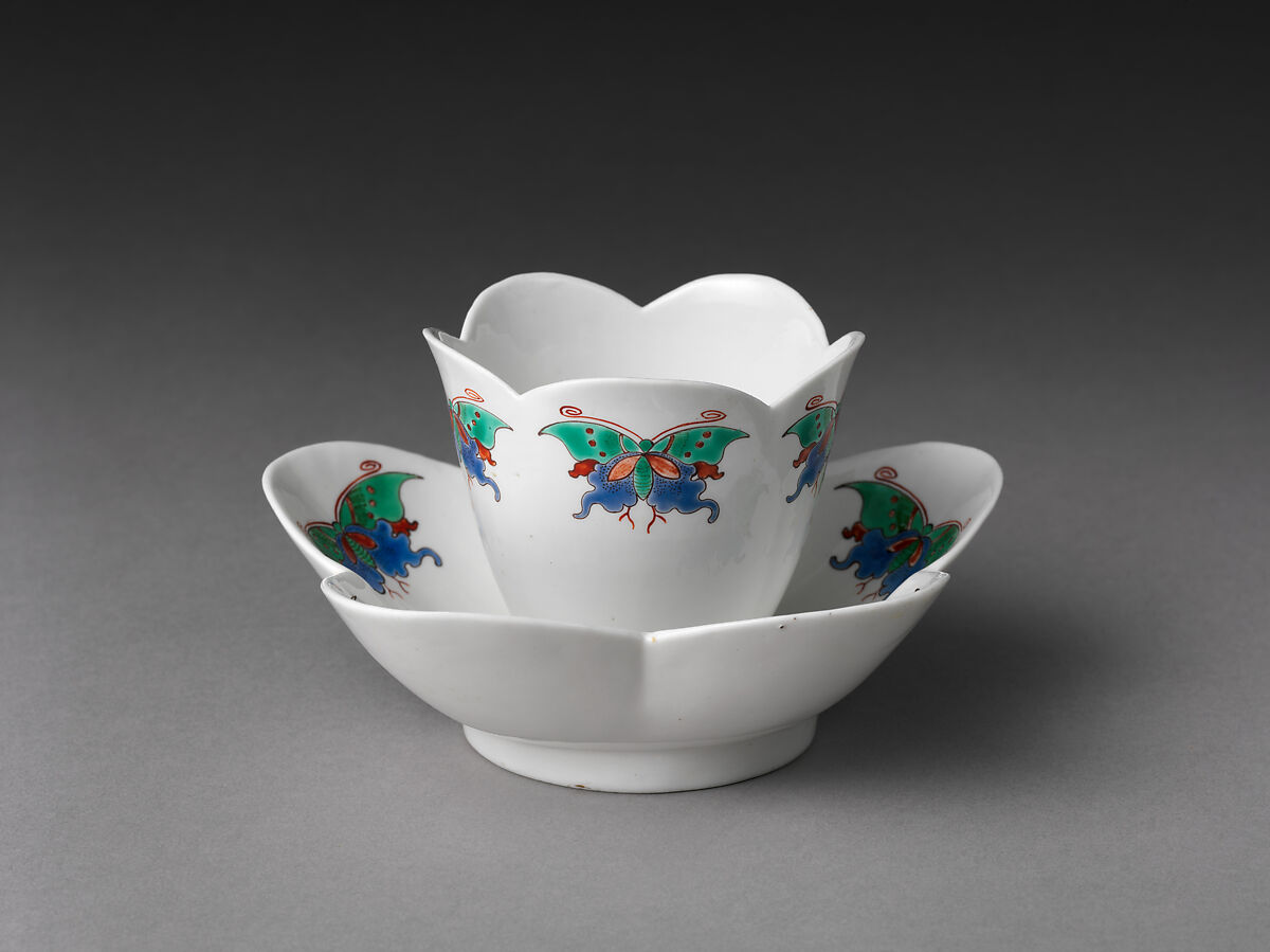 The highly formal arrangement of stylized butterflies within a lobed form indicates that this motif (which appears on both dishes) is of Chinese origin, adapted by the Japanese to their own sense of design and color and their sense of European taste. The almost pure-white body of the Japanese example, called nigoshide, was developed for export and was used only for pieces with exclusively overglaze-enamel decoration. The lobed shape and the butterfly pattern were each copied individually at European factories, but Chantilly produced the only exact copy of the Asian import.