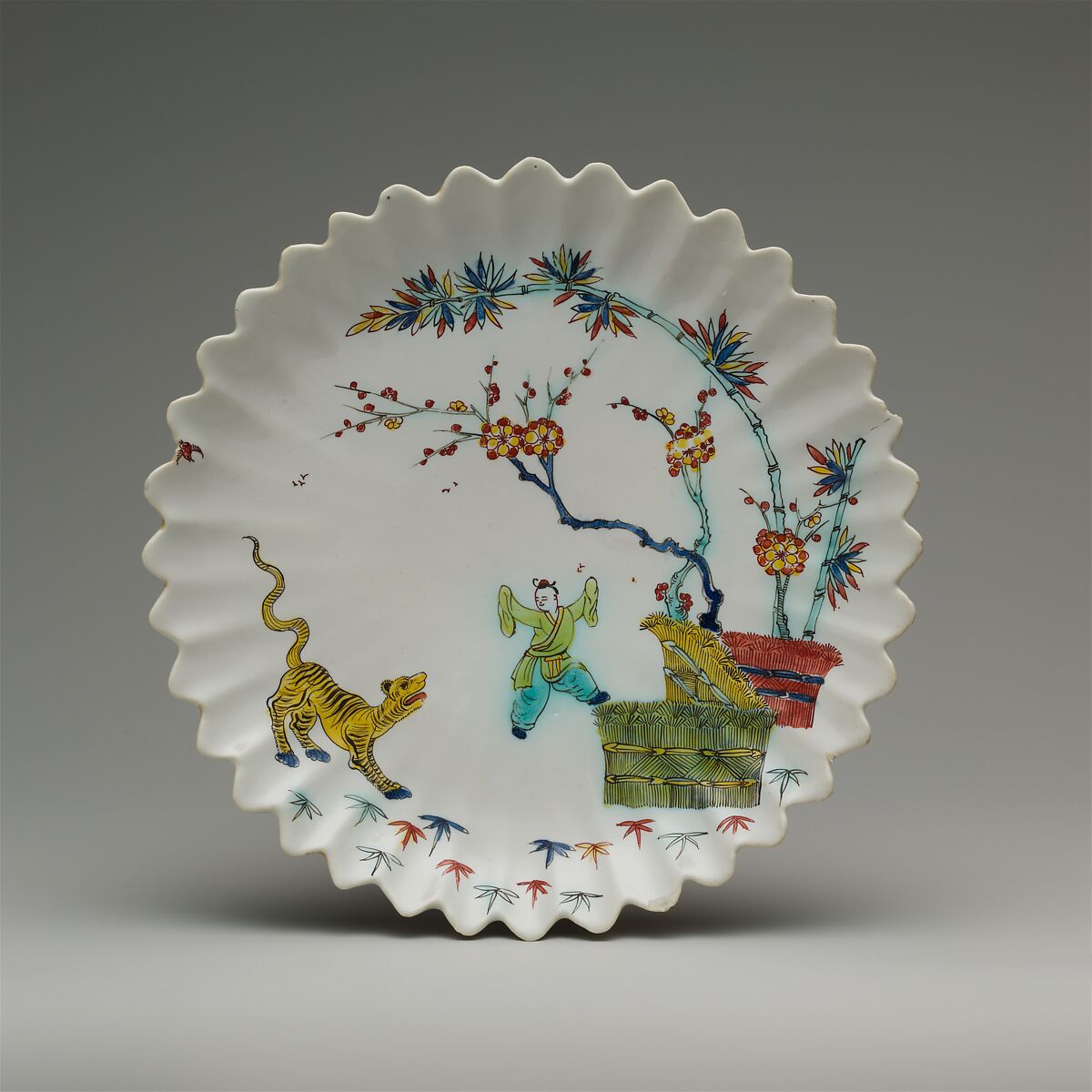 A more direct dependence on Japanese ceramics is evident in this Villeroy dish. The molded fluting and the scalloped rim of the dish follow closely a model found frequently in Japanese Kakiemon porce-lain,[9] although the rim of Villeroy dish was created by cutting away the unfired clay rather than being formed in the mold, as would have been done with the Japanese examples. The painted decoration on the Villeroy dish is also derived from Kakiemon porcelains. The scene depicts a young boy standing near two banded hedges from which emerge branches of prunus (flowering plum) and bamboo, and a yellow tiger crouches off to one side. These last three motifs have their origins in Chinese art and represent some of the most popular and durable of all motifs used to decorate Chinese porcelains. Appropriated by Japanese potters, these motifs became mainstays of Kakiemon-style porcelains, and a Japanese example decorated in this manner may have served as the model for the potters at Villeroy.