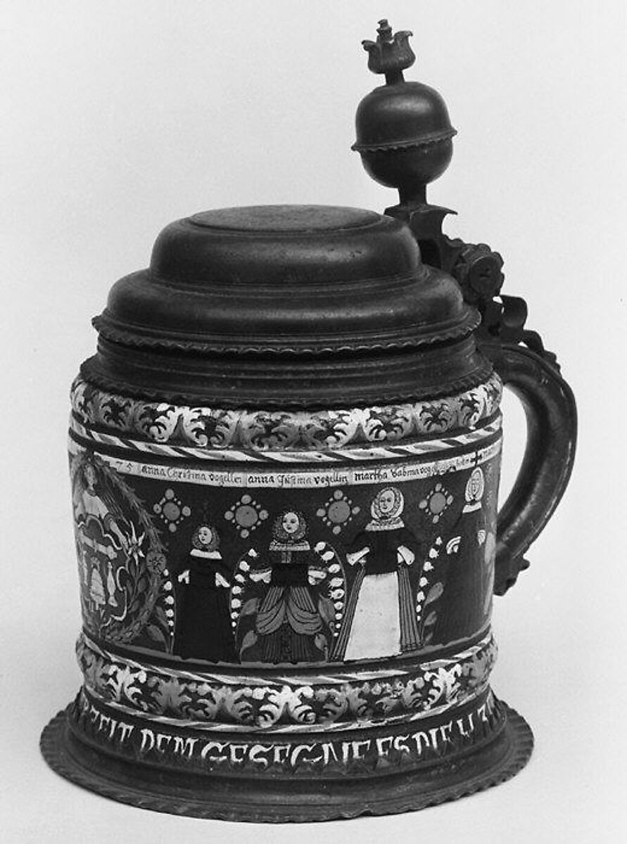 German stoneware tankards were brought to America in large numbers on Dutch fur-trading ships. Shards of these popular vessels have been uncovered at seventeenth century sites in New York and New England.