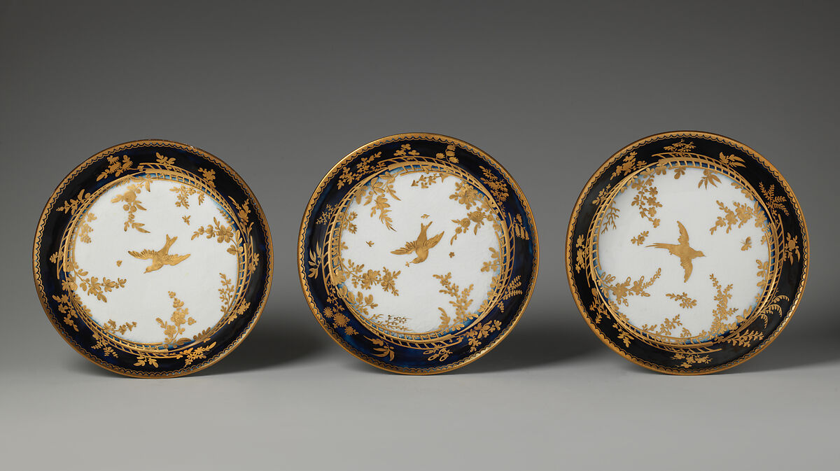 The gilding on these pieces (see 54.163.7a, b–.34) is of a very high order, with tooled work on a thick application of honey gilding selectively matte and burnished for a lively design of pheasants, peacocks, and swallows in a landscape. The deep bowl was for little cakes.