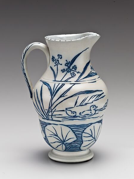 Laura A. Fry of Cincinnati, a multitalented decorator working with the Cincinnati Pottery Club at the newly established Rookwood Pottery, drew inspiration from the Doulton stoneware at the Centennial. As seen in this pitcher, she was particularly drawn to the type of scratch blue work practiced by the sisters Hannah and Florence Barlow, both prominent decorators at Doulton. They made a specialty of incised designs filled in with dark, usually cobalt blue oxide. A revival of the scratched blue stoneware produced in England urging the eighteenth century, this manner of linear decoration conformed to the demands of the English Reform style. Dated 1881, the pitcher features a tripartite design in horizontal bands, an arrangement favored by the Barrows. The decorative motifs—swimming ducks arranged across the middle register and stylized lily pads filling the band below—as well as the very form of the vessel, are based on Doulton models. Despite the similarity of design, Fry's pitcher differs significantly in the materials and methods of fabrication. Hers is of earthenware rather than stoneware with a different blue colorant and a clear, low-fired glaze instead of a salt-glaze. Like many American ceramic artists who sought to emulate what they had seen at the Centennial, Fry cleverly used the limited resources that were available to her to create the animated design.