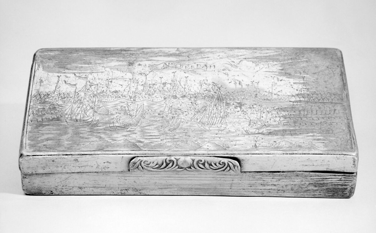 The box is rectangular. The lid is decorated with a view of Amsterdam and its harbor. The towers at the far sides are probably the Montelbaanstoren and the Schreierstoren, the rampart towers of 1512 and 1487. The box is inscribed: Amsterdam.