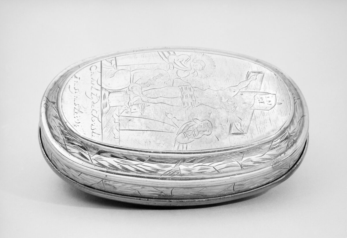 An oval box. The lid depicts Christ being nailed to the cross by two men, while a third digs a hole for the cross. Inscribed at top of cross: Inri; and below: Het leijde christi in het leven (The suffering of Christ in his life).