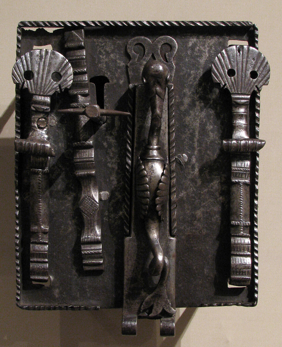 The shrine of Saint James the Great at the cathedral of Santiago da Compostela was one of the most popular pilgrimage sites of the Middle Ages. Cockleshell emblems of the saint appeared everywhere in Spanish ornament, from nail heads to window grilles. They appear on the bottom end of the two giant staples by which this lock was attached to a coffer or chest. A winged monster with a fish tail ornaments the hasp of the lock; a swiveling baluster conceals the keyhole.