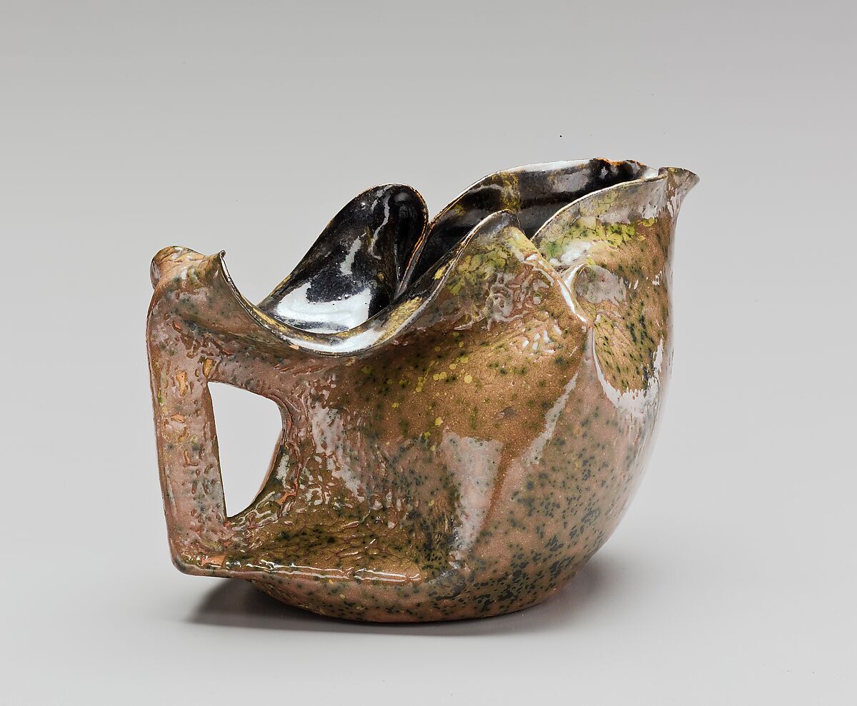 This small pitcher illustrates another inventive way in which Ohr played with functional forms. Rather than adding a handle, Ohr squeezed together one end of the vessel, flattened it, and cut a hole to create an integrated handle.