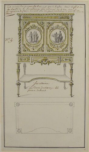 On December 30, 1773, the marchand mercier Simon-Philippe Poirier sold Madame Du Barry "a secretary with French porcelain on a green ground highly decorated with gilt-bronze mounts." That description fits this piece which has, furthermore, porcelain plaques bearing the date letter for 1773. Since the secretary is not listed in Madame Du Barry's inventory it is possible that she intended the piece as a wedding gift for Louis XVI's younger brother Charles-Philippe, comte d'Artois and the future Charles X (1757-1836) and Marie-Thérèse of Savoy (1756-1805) who were married in 1773. A similar piece of furniture was, indeed, recorded among the comtesse d'Artois's belongings at Versailles in 1795. Although the description is very detailed and even included dimensions that correspond to those of the Metropolitan's secretary, it failed to mention the color of the borders on the Sèvres plaques. It could thus as easily refer to a closely related secretary now at Waddesdon Manor in Aylesbury, England, which has plaques with blue borders.