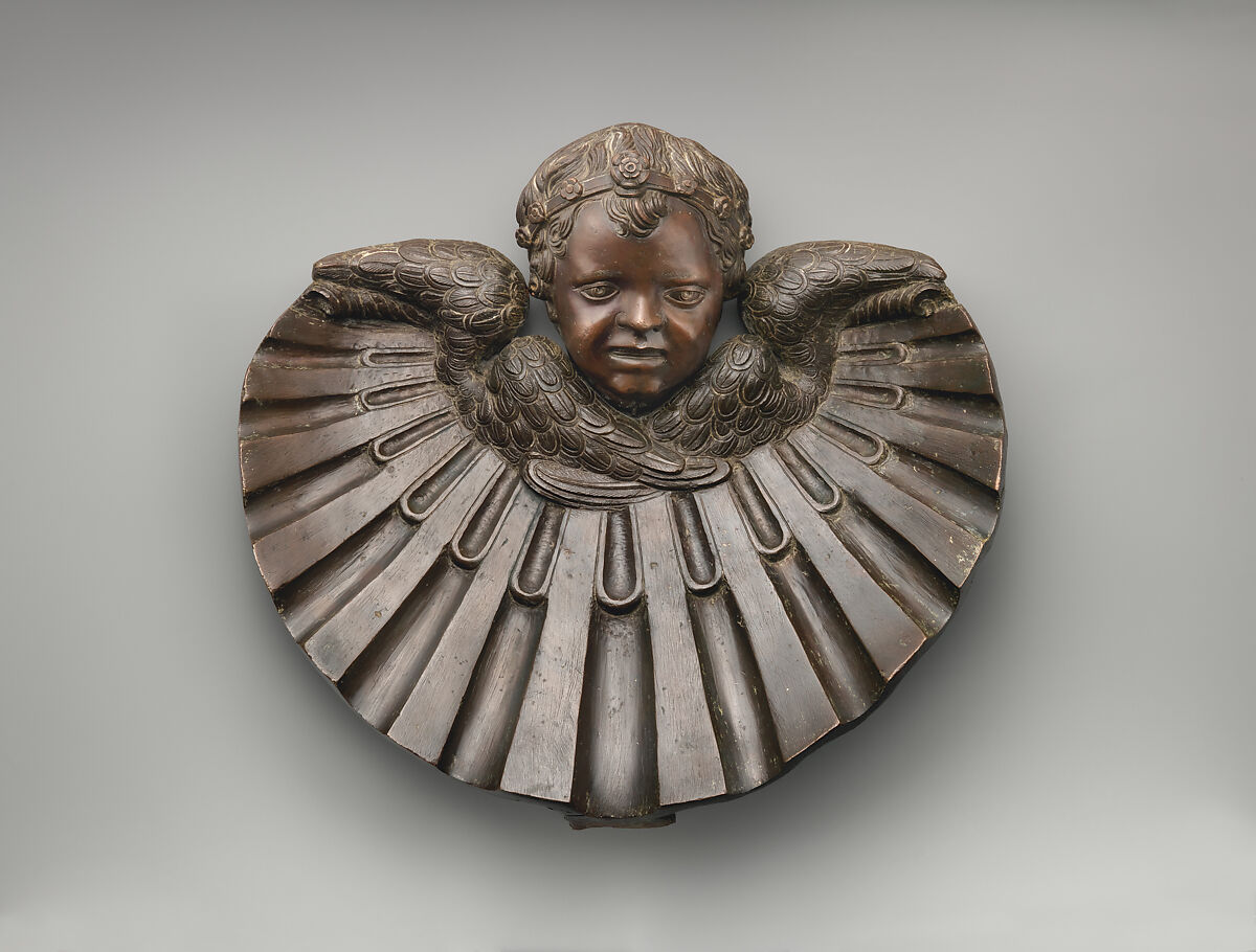 In the Catholic tradition, four-winged cherubim belong to the second order of the hierarchy of angels and attend close to God in heaven. In this remarkable bronze, a single cherub is crowned with a fillet dotted with flowers. The tops of two arched wings flank its head; another pair gently enfolds beneath its chin. A large scallop-shaped shell fans outward below the wings like an expanding burst of radiance. With lowered head and wide-open eyes, the cherub looks downward, revealing its teeth in a broad smile. Its transfixed expression conveys the encompassing, beatific joy of beings who dwell in God’s presence as witnesses to divine glory. The shell is a symbol of baptism and pilgrimage that in its metaphorical sense alludes to the journey of the soul upward toward God.
