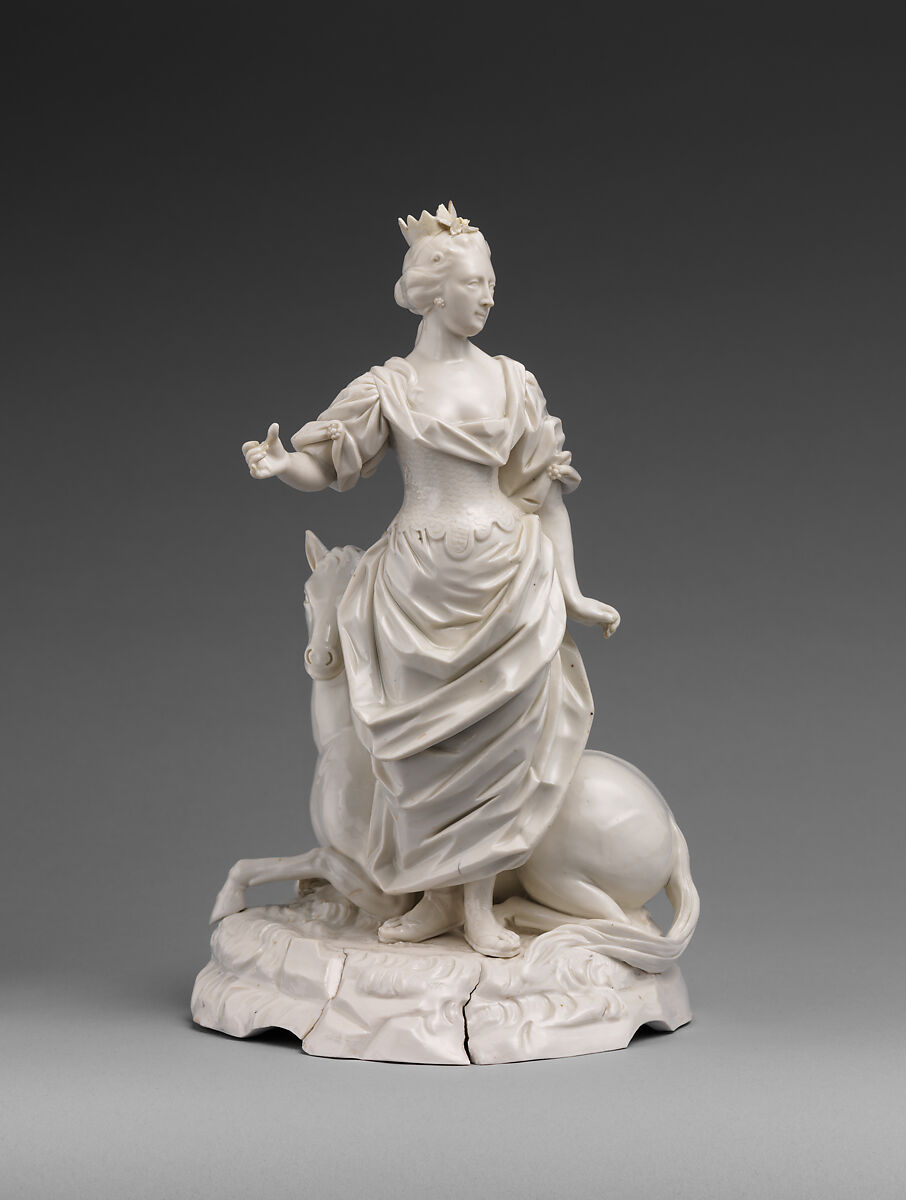 In the eighteenth century, small-scale figurines representing the allegories of the four continents were a popular fixture in genteel spaces. While the dissemination of such iconography in print form encouraged scholarly reflection, its migration into the realm of the decorative arts prompted whimsy and pleasure. The polished surfaces and exquisite detail of this ambitious group by the Fulda Manufactory afforded European viewers the intimate, tactile experience of beholding representations of other continents, whose precious goods and natural resources they coveted.