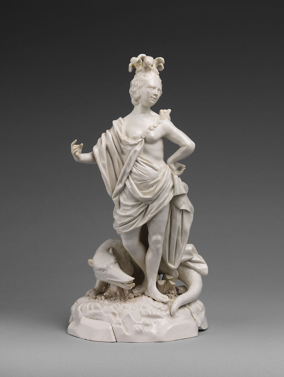 In the eighteenth century, small-scale figurines representing the allegories of the four continents were a popular fixture in genteel spaces. While the dissemination of such iconography in print form encouraged scholarly reflection, its migration into the realm of the decorative arts prompted whimsy and pleasure. The polished surfaces and exquisite detail of this ambitious group by the Fulda Manufactory afforded European viewers the intimate, tactile experience of beholding representations of other continents, whose precious goods and natural resources they coveted.