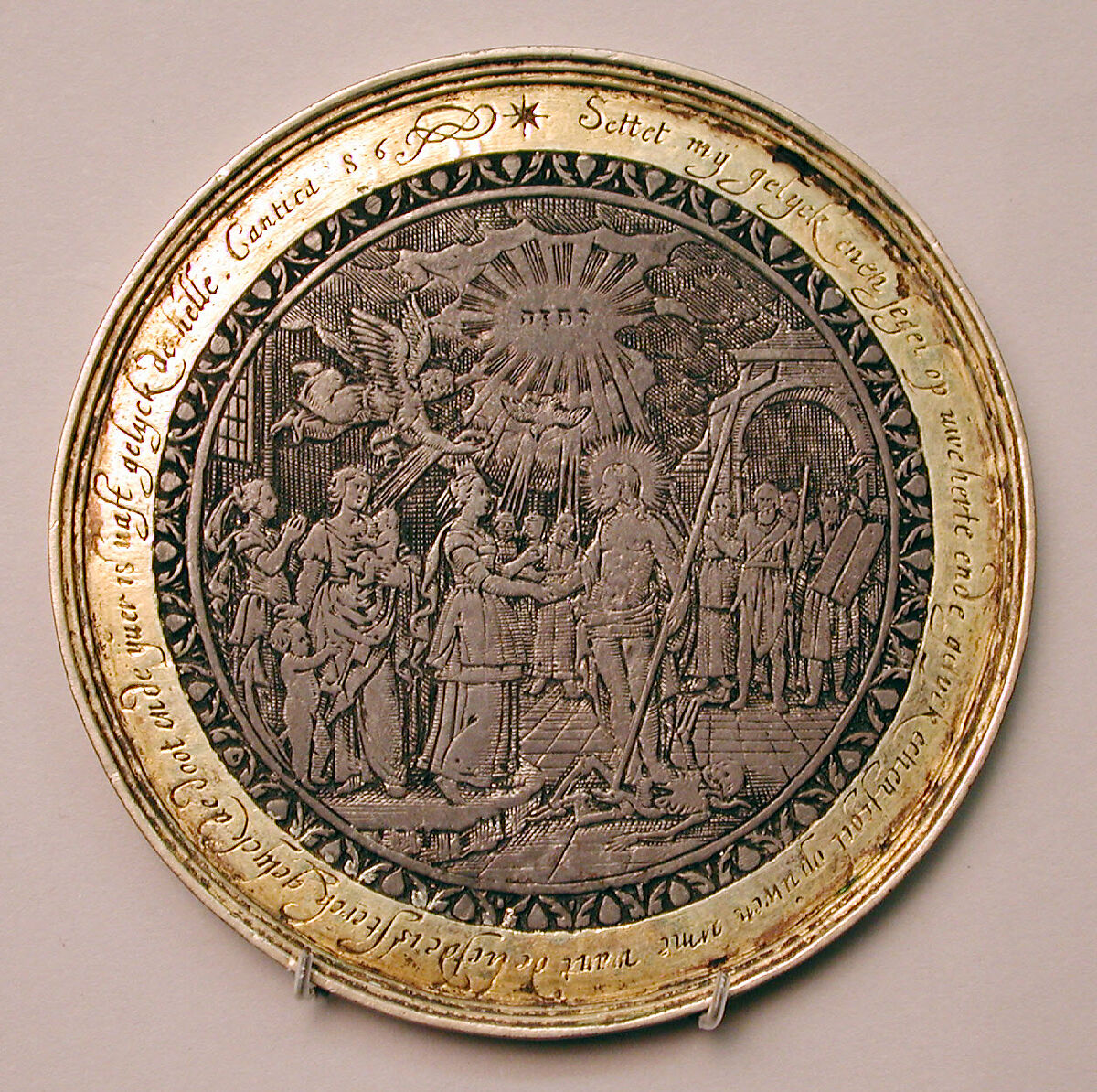 A large number of Dutch seventeenth-century engraved silver medals have survived. Some of these were designed to commemorate a special occasion, others, the more common ones, were more generic and were available for purchase to anyone. Among the latter, were so-called huwelijkspenningen, pledges of the promise of marriage, presented to the future bride as proof of the betrothal. After the wedding ceremony had taken place, names and dates could be added to the medal. This silver and silver-gilt huwelijkspenning shows on one side Christ, trampling death, and holding a large cross in his left hand. With his right-hand Christ clasps the hand of the female allegory of Faith holding a chalice in her left hand. A floral wreath is held aloft above her head by an angel. Figures symbolizing Charity and Hope are seen behind Faith. Above a cartouche in radiant light is inscribed with the name of Jehovah. Moses can be identified among the figures in the background by the two stone tablets inscribed with the Ten Commandments he is holding.