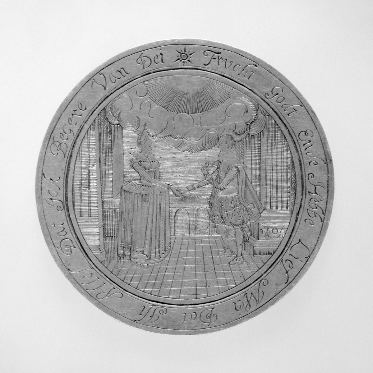 A large number of Dutch seventeenth-century engraved silver medals have survived. Some of these were designed to commemorate a special occasion, others, the more common ones, were more generic and were available for purchase to anyone. Among the latter were so-called huwelijkspenningen, pledges of the promise of marriage, presented to the future bride as proof of the betrothal. After the wedding ceremony had taken place, names, initials and a date could be added to the medal.