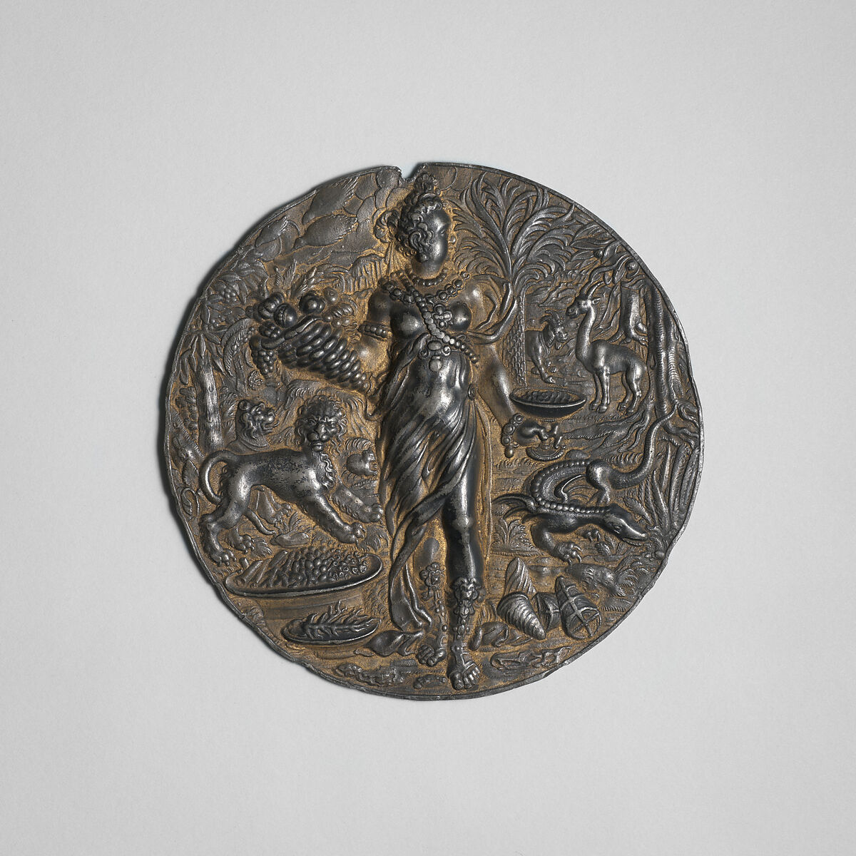 During the Renaissance, Europeans recognized four continents. Each figure on these plaquettes (60.70.1-.4) personifies one of them. Europe’s clothing and attributes denote empire, military strength, and artistic accomplishments, whereas those of Africa, America, and Asia represent the precious goods that Europeans coveted. Far from accurate representations, this imagery reinforced the fiction of European superiority over other peoples and cultures.