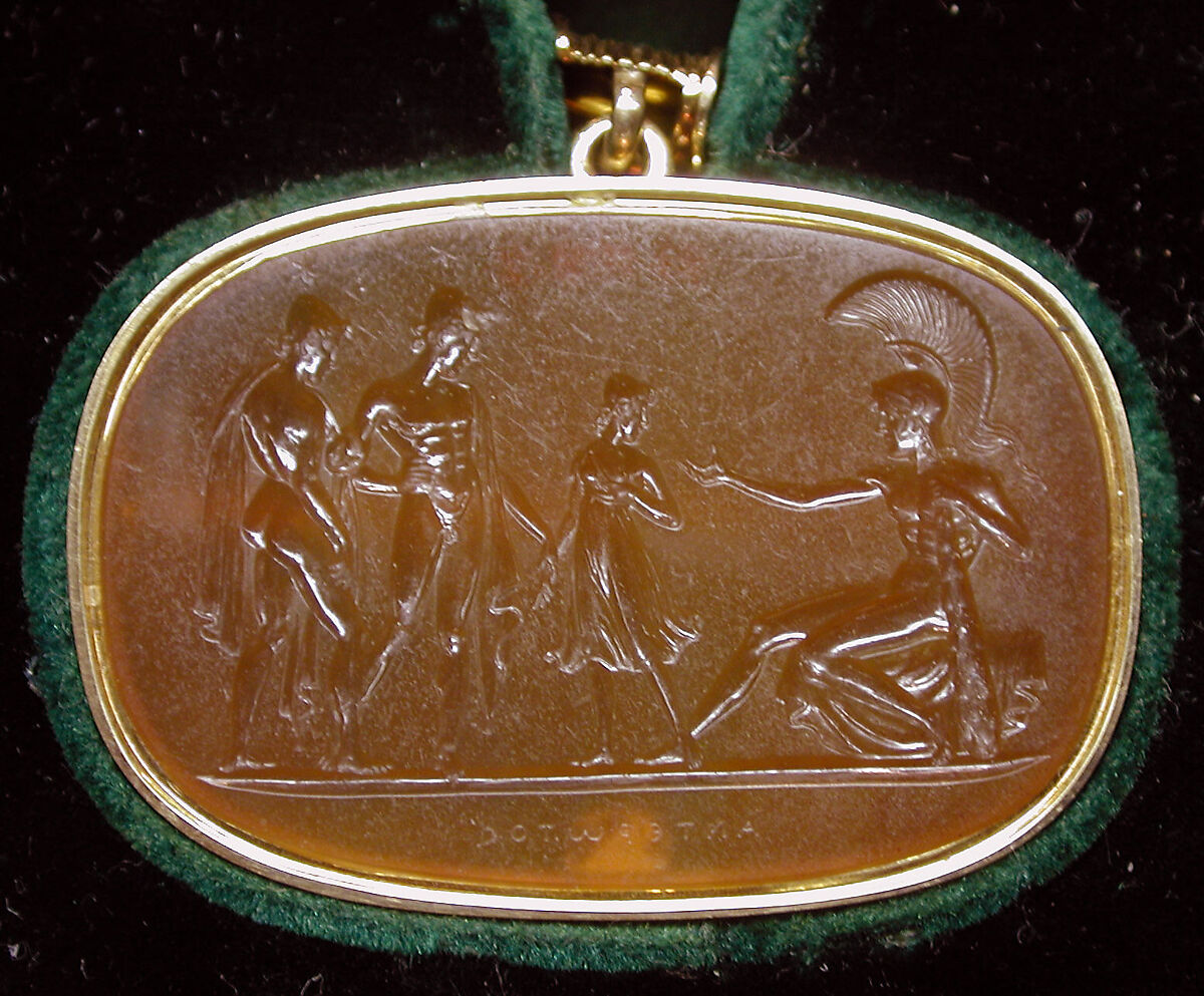 The intaglio is one of six known fakes at the Met from the storied gems collection of Prince Stanislaw Poniatowski of Poland. Carried out in a classicizing style indebted to Antonio Canova, the gem bears a false signature intended to announce its authorship by one of the celebrated carvers of ancient Greece. The deception of the Poniatowski gems – most of which are nineteenth-century forgeries – was discovered in 1895. The Museum’s six were mounted in velvet boxes by Tiffany & Co.