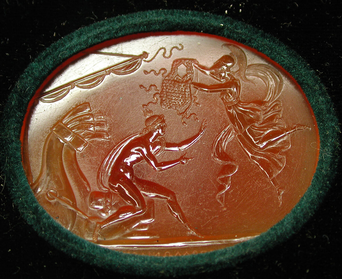 The intaglio is one of six known fakes at the Met from the storied gems collection of Prince Stanislaw Poniatowski of Poland. Carried out in a classicizing style indebted to Antonio Canova, the gem bears a false signature intended to announce its authorship by one of the celebrated carvers of ancient Greece. The deception of the Poniatowski gems – most of which are nineteenth-century forgeries – was discovered in 1895. The Museum’s six were mounted in velvet boxes by Tiffany & Co.