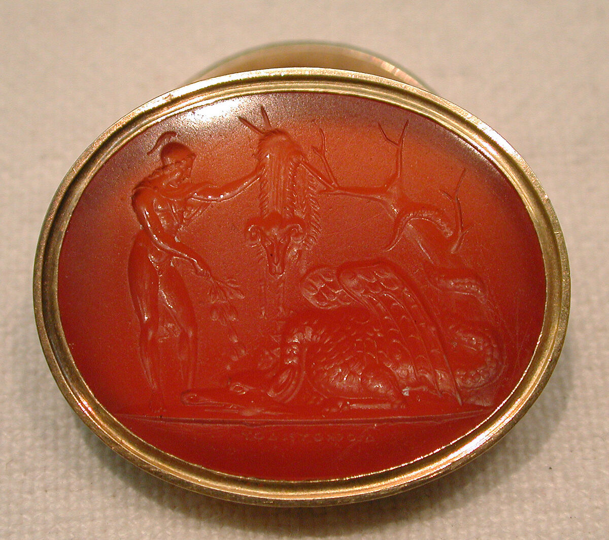 The intaglio is one of six known fakes at the Met from the storied gems collection of Prince Stanislaw Poniatowski of Poland. Carried out in a classicizing style indebted to Antonio Canova, the gem bears a false signature intended to announce its authorship by one of the celebrated carvers of ancient Greece. The deception of the Poniatowski gems – most of which are nineteenth-century forgeries – was discovered in 1895. The Museum’s six were mounted in velvet boxes by Tiffany & Co.