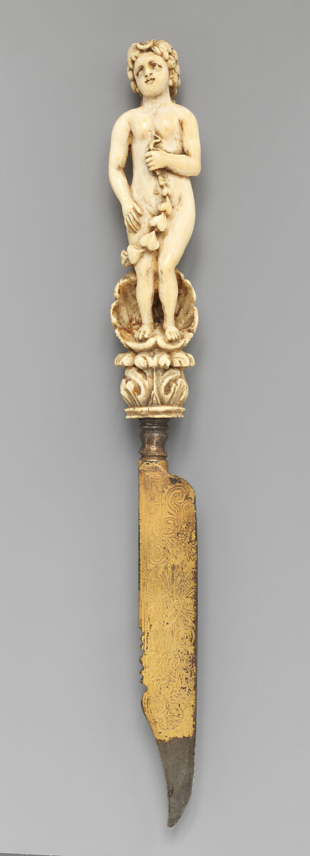 - Title: Knife with carved handle of nude female with crescent in hair standing in a half shell holding a swag