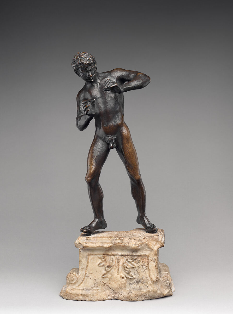 The figure, while not a satyr (no tail), is meant to be Marsyas, Apollo’s foe, playing double panpipes (now lost), which were secured by the leather strap at his mouth. It derives from an ancient composition widely copied since the fifteenth century. The Medici owned bronze examples, one called the “Nude of Fear” (Ignudo della Paura), no doubt seen as a representation of that emotion because it seemed caught in the act of recoiling.[1] There is no consensus on a small host of reproductions that run a wide gamut in composition and facture. Some have prompted ambitious attributions. John Pope-Hennessy ventured to assign the most sculptural piece—a vital, rangy example now in the Bargello—to Donatello himself, and Verrocchio has also been wrongly proposed.[2]