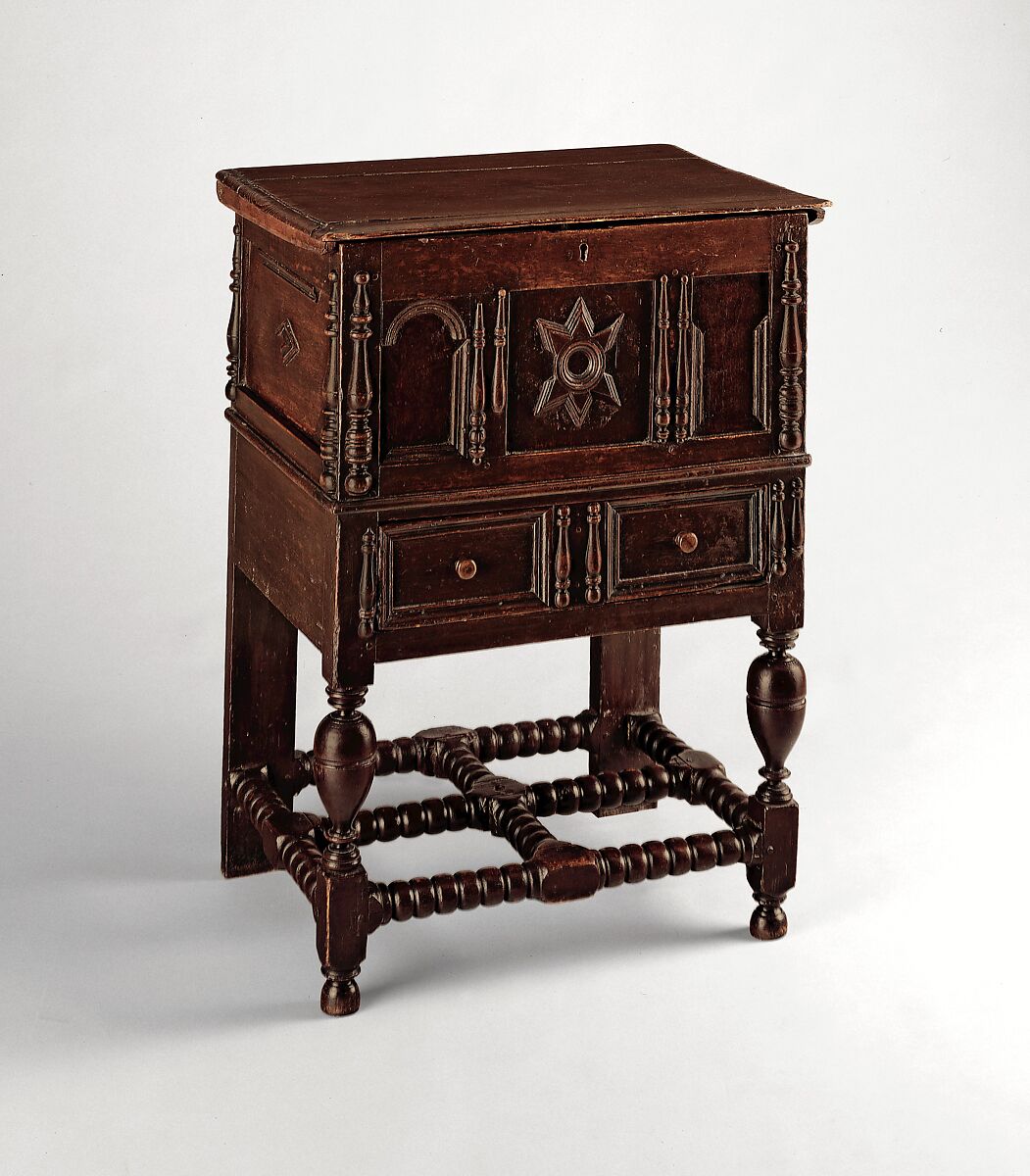 What purpose this small lift-top chest with a drawer on high legs was intended to serve is not entirely clear. It may have been what is designated in period inventories as a “chamber table,” used in a bedroom as a washstand or possibly to store chamber pots.