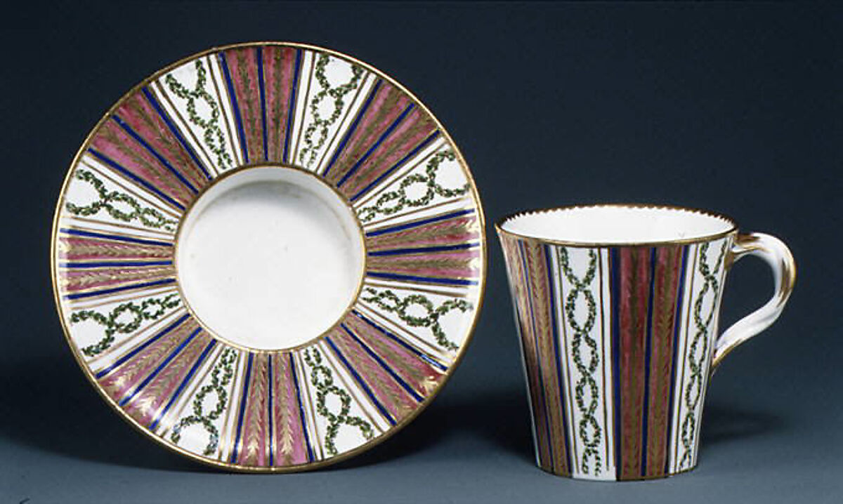 The socketed saucer (soucoupe enfoncé) provided stability by means of the deep well in which the cup sat. This type of cup, likely intended for milk drinks, was probably also used for hot chocolate; a 1771 French catalogue refers to this form as a chocolate cup. It is now thought that the gobelet et soucoupe enfoncé was for use by the sick. It was probably designed for Madame du Pompadour (d. 1764), the only purchaser of this specific type of cup and saucer during her lifetime. Later examples were acquired primarily by the French royal family or by members of the court.