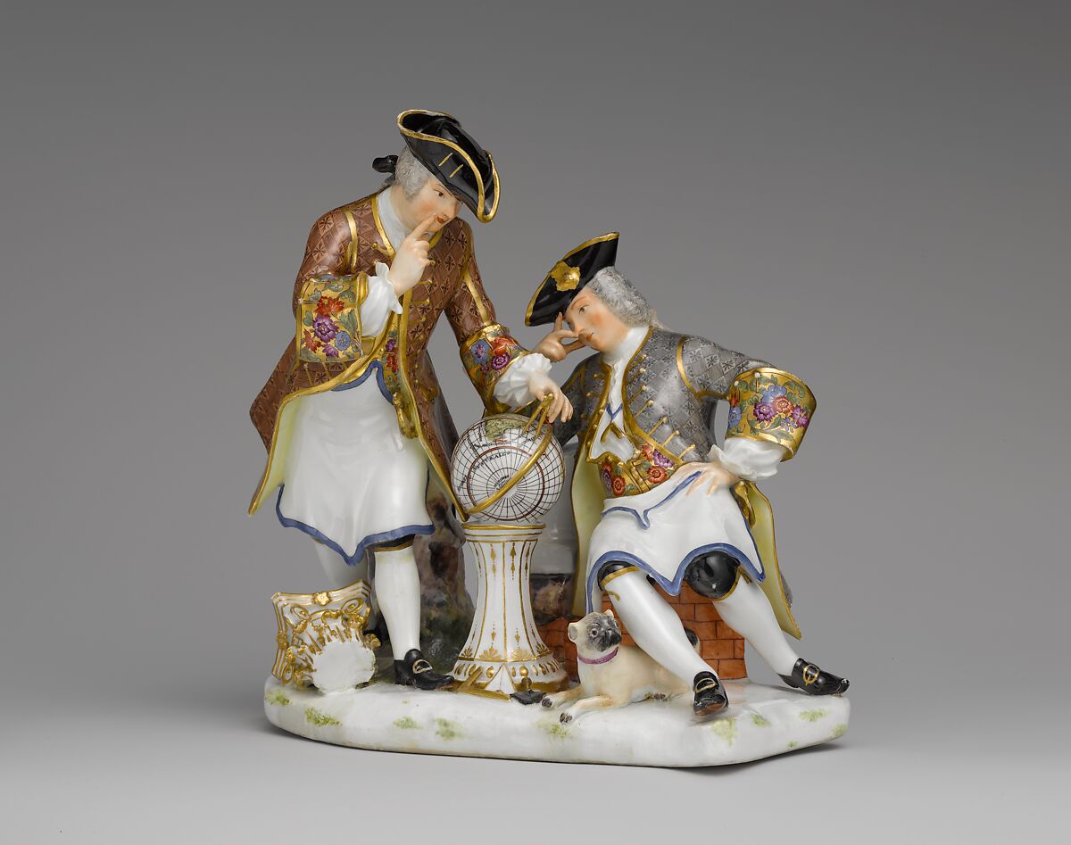 At the same time the Meissen factory was producing figures depicting characters from the commedia dell’arte (see 1982.60.309), it was also creating figures that portrayed men and women from the upper strata of society engaged in a variety of activities. The majority of works from this latter category depict a man and a woman in some sort of leisure pursuit, most of which have a decidedly amorous undercurrent. However, this figure group of Two Freemasons stands somewhat apart from many of the figures modeled in the mid-1740s with its representation of members of a fraternal organization, a marked contrast to those figure groups that portray fashionably dressed figures engaged in a daily activity, such as taking tea or writing a letter.