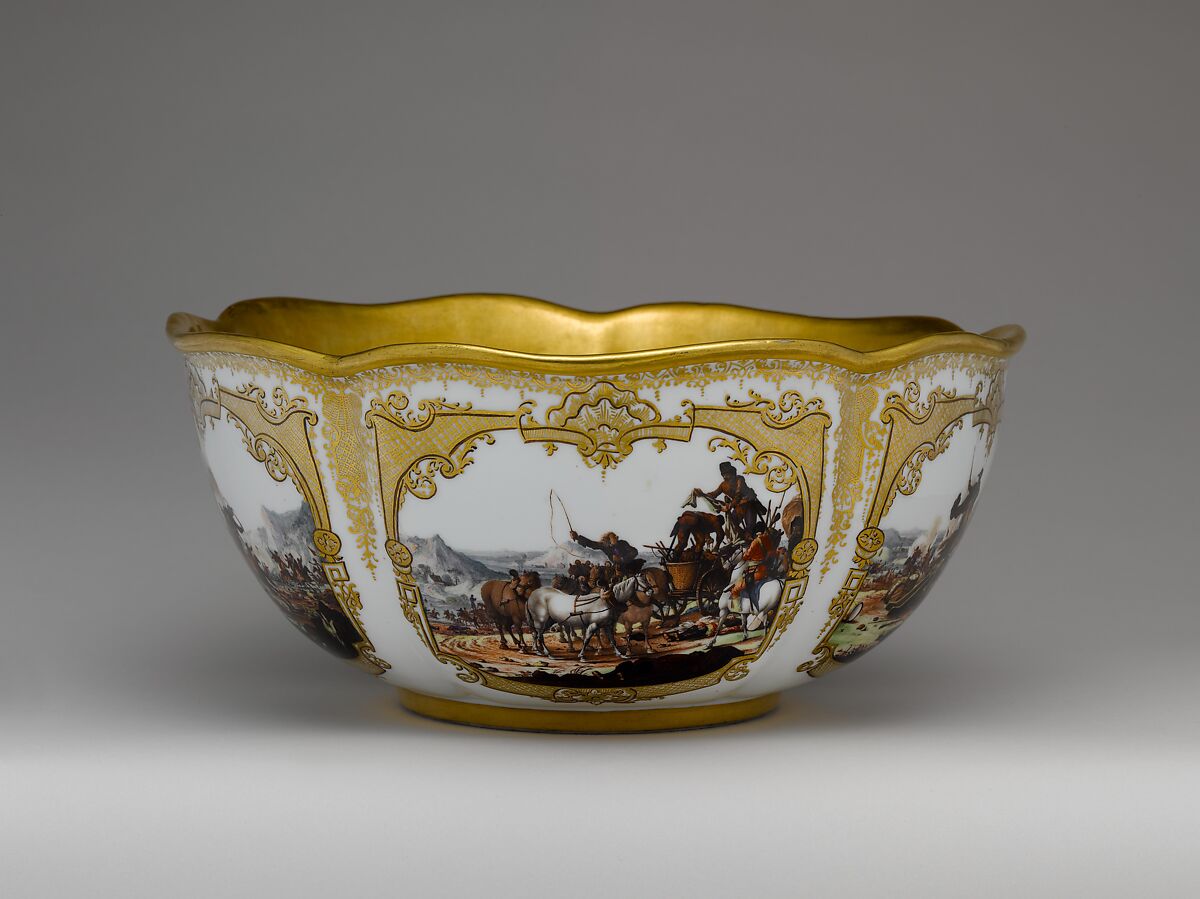 Battle scenes—based on, if not copied from, engravings—were popular towards the middle of the century. Most have been attributed to Georg Philipp Rugendas (1666–1772), but as the scenes on this bowl have not been traced to him they may represent the work of an intermediate artist.