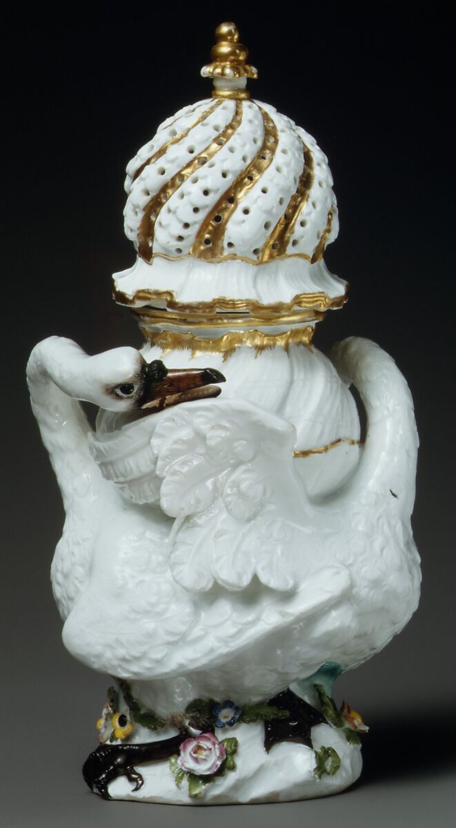 This object was originally part of one of the most celebrated porcelain dinner services produced in the eighteenth century. The service, which numbered approximately 3000 pieces, was made for Heinrich, Count von Brühl (1700–1763), the director of the Meissen factory. It is commonly referred to as the “Swan service” due to the motif of swans executed in low relief that appears on most of the components of the service. This composition of the swans swimming amid reeds is based on an etching of 1654 by Wenceslaus Hollar after Francis Barlow (ca. 1626–1702). Bruhl commissioned the service in 1737, and due to its size and complexity, it took approximately four years to produce.