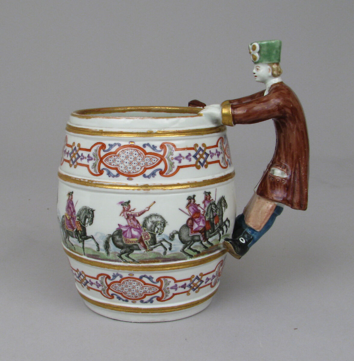 Representations of coopers, appropriate for figural handles of barrel-shaped tankards, are known on six surviving examples made at Du Paquier. Barrel-shaped tankards in three sizes are frequently mentioned in the list of prizes in a lottery of Du Paquier porcelain held in 1735 and are almost always referred to as Wermuth-Fass or Wermuth-Vässel (literally, “Wermuth barrel”). Wermuth was a popular type of beer or wine flavored with bitter wormwood.