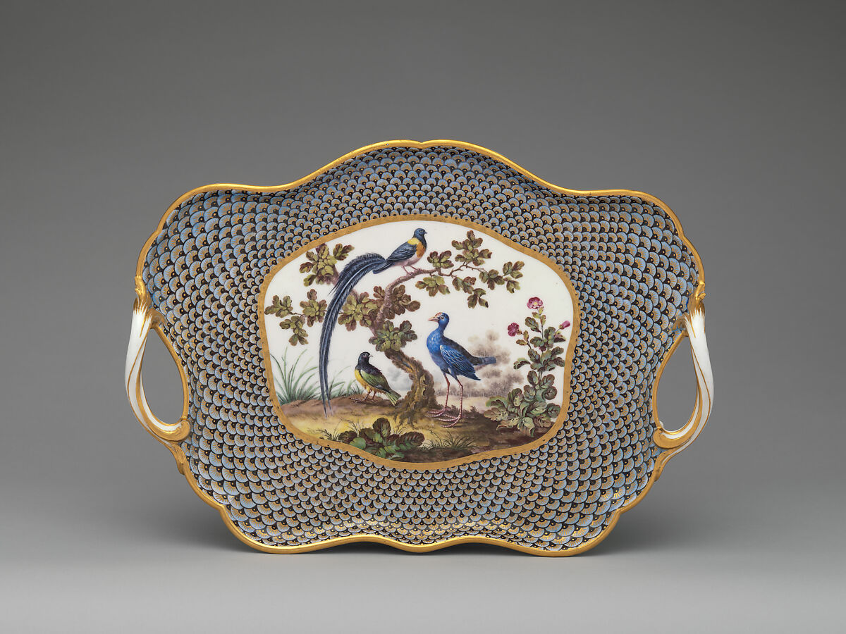 Birds were depicted on Vincennes and then Sèvres porcelain from the earliest years of production at Vincennes, but they were painted as fanciful creations and employed as decorative elements with no concern for fidelity to actual birds. Most of these early painted creatures had little delineation and their coloring was entirely arbitrary. It was not until the late 1760s that the painters at Sèvres began depicting birds that were accurate representations of those found in nature, rendered with specificity and accurate coloration. The impetus for this change was the availability of hand-colored etchings of birds published in George Edwards’s (British, 1694–1773) A Natural History of Birds (1743–51) and his Gleanings of Natural History, issued in a series of volumes between 1747 and 1764.[1] The first pieces of Sèvres porcelain decorated with birds copied from Edwards’s prints were produced for Charles Lennox (1735–1806), 3rd Duke of Richmond, who had lent his own copies of Edwards’s volumes to the factory to serve as models.[2] A dessert and tea service with ornithological decoration derived from Edwards’s works was completed in 1766 for Richmond initiating a fashion for this new type of bird painting that was to last only a relatively short time.