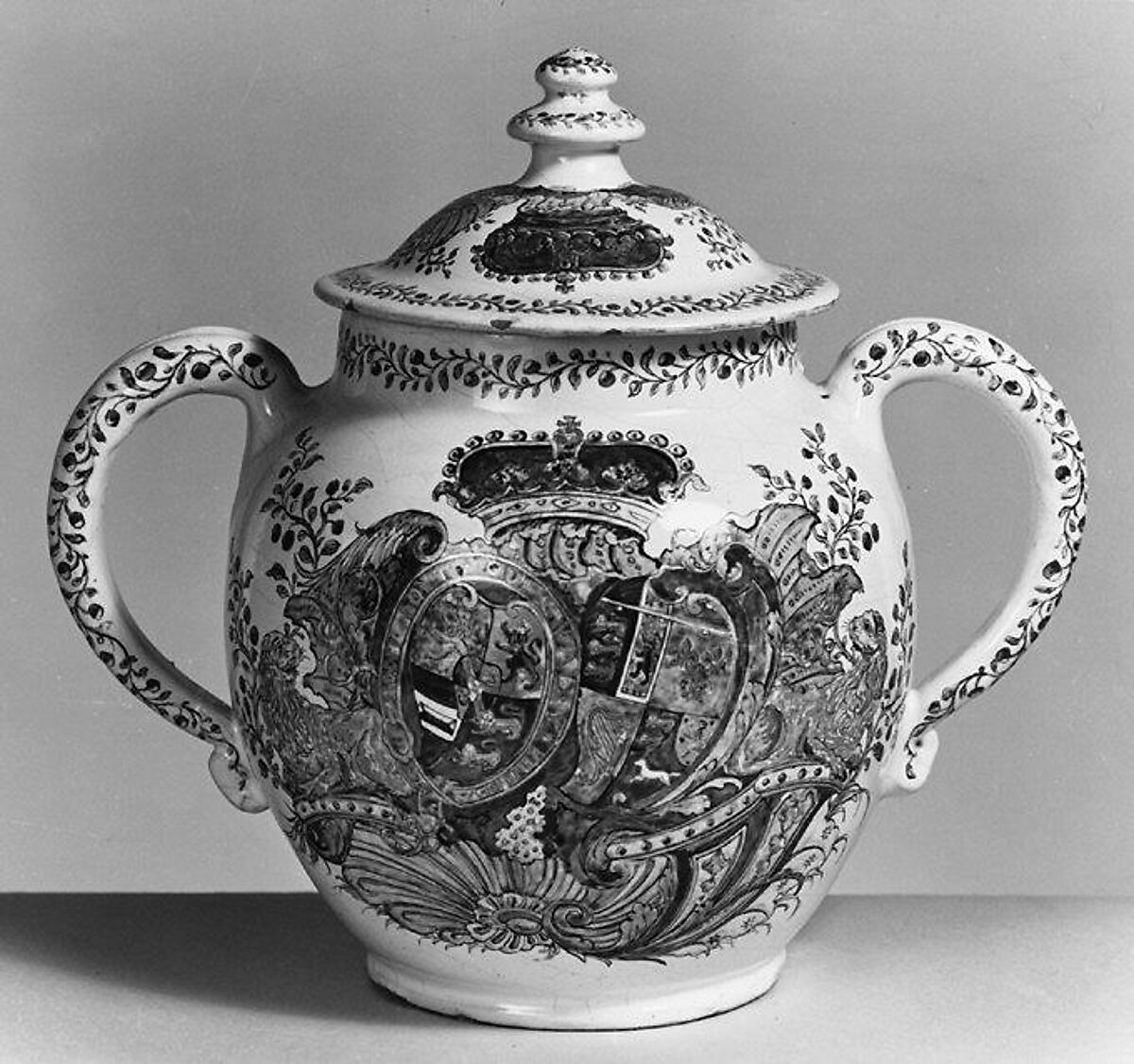 This covered jar was presumably made to commemorate the accession of William IV of Orange to the Stadhoudership in May, 1747. His wife, whom he married in 1734, was Anna (1702–1759), Princess Royal, daughter of George II of England. A Delftware tea caddy in the Museum's collection (1977.22.2) commemorates the same event.