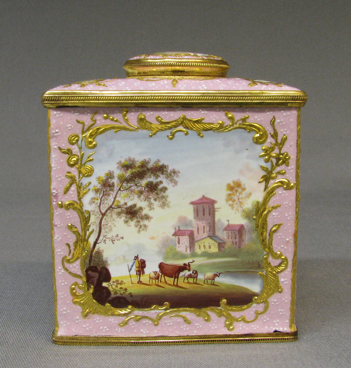 Enameled objects like this one, intended to imitate the lustrous quality of porcelain, were among the more affordable goods sold at toyshops across London and in fashionable English resort towns. Though often called "Battersea enamels" in common parlance (referring to the manufactory at York House, Battersea, operating only between 1753 and 1756), we rarely know exactly where individual pieces were made. The main centers of enamel production were in London, South Staffordshire (particularly in Bilston and Wednesbury), and Birmingham.