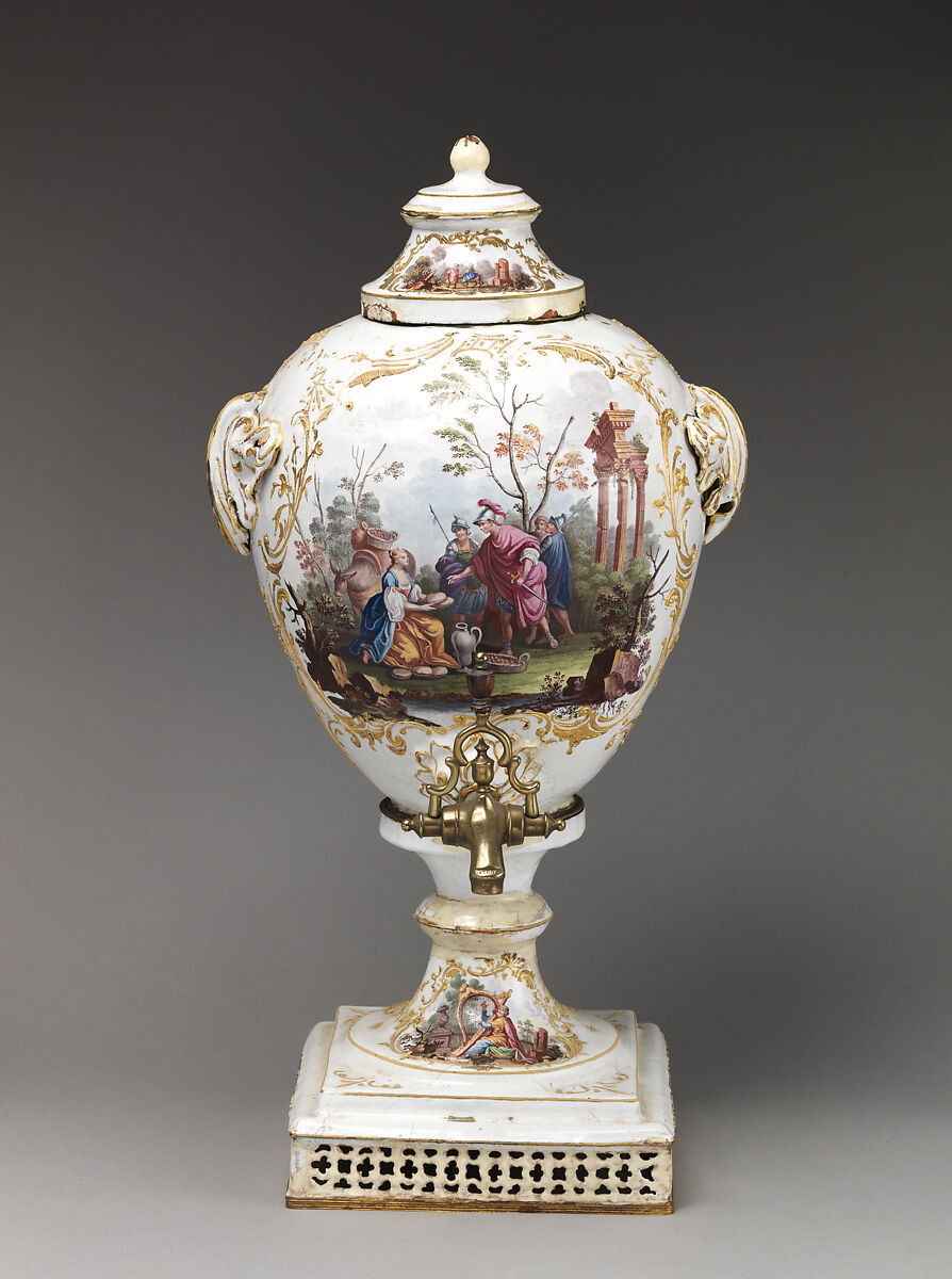 Tea—imported from China in increasingly high volumes over the course of the eighteenth century, but still relatively expensive—could be conserved by diluting it with hot water from an urn. Unusually large for an enamel object, this urn is decorated with two monumental scenes from the Old Testament, in addition to several smaller designs adorning its foot and cover. Both images on the urn’s body are based on prints published by Joseph Wagner ca. 1745, after Jacopo Amigoni (a mid-eighteenth-century Italian artist best known for his society portraits and decorative frescoes in the Venetian Rococo style). On one side of the urn, Abigail offers bread and other provisions to David, entreating him not to exact revenge on her husband for initially refusing to provide help. On the other side, Abraham’s steward selects Rebecca, who had been fetching water from a well, to be the wife of Isaac, Abraham’s son.