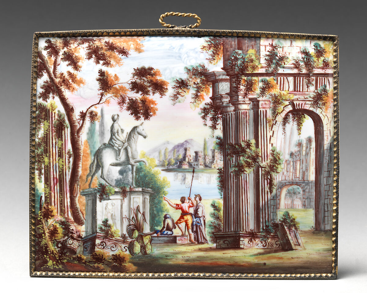 This decorative plaque is one of a set of four depicting idealized landscapes, two of which incorporate classical elements in the style of Giovanni Paolo Panini. Each of these plaques was probably intended to be set into the lid of a japanned toilet box, made to hold cosmetics or other products that would have been used during the morning ritual of dressing. All four of these boxes would fit into a larger japanned casket, also decorated with an enamel plaque set into its lid.