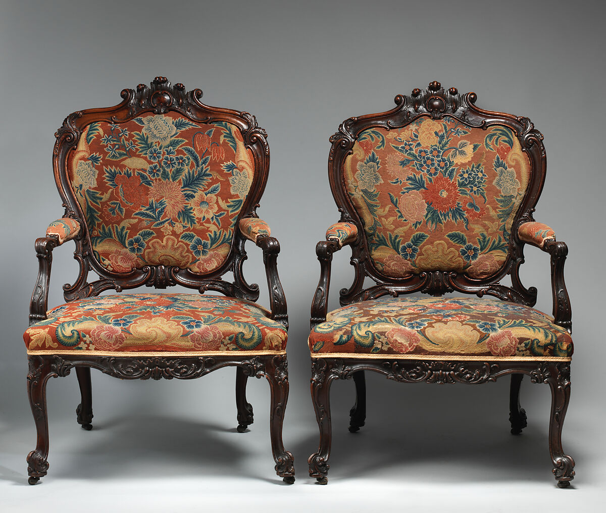 Part of a set of seat furniture previously at Lavington Park, Sussex, the chair is related to a design for a so-called "French chair" in the third edition of Thomas Chippendale's The Gentleman and Cabinet-Maker's Director (1762). Chippendale suggested to create an open space between the cartouche-shaped back and the seat in order to lighten the overall effect of this drawing-room chair.