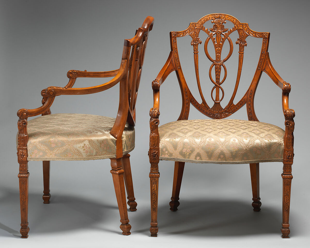 The center of the shield-shaped back is derived from Thomas Sheraton's Cabinet-maker and Upholsterer's Drawing-book (1793).
