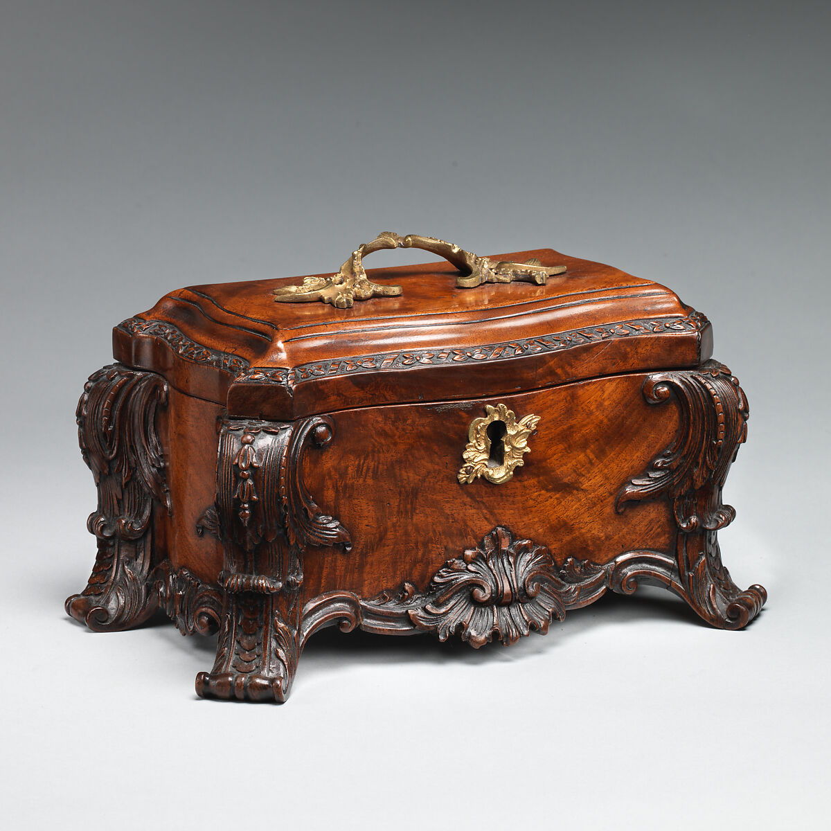 The English satirist Jonathan Swift (1667–1745) wrote in his Directions to Servants (1729) about "small chests and trunks with lock and key, wherein they keep the tea and sugar." Executed in a late Rococo style, this example, with its serpentine sides, scroll feet, and crisp carving on front and sides, displays some similarities to designs in the first and third editions of Thomas Chippendale’s Gentleman and Cabinetmaker’s Director (1754, 1762).