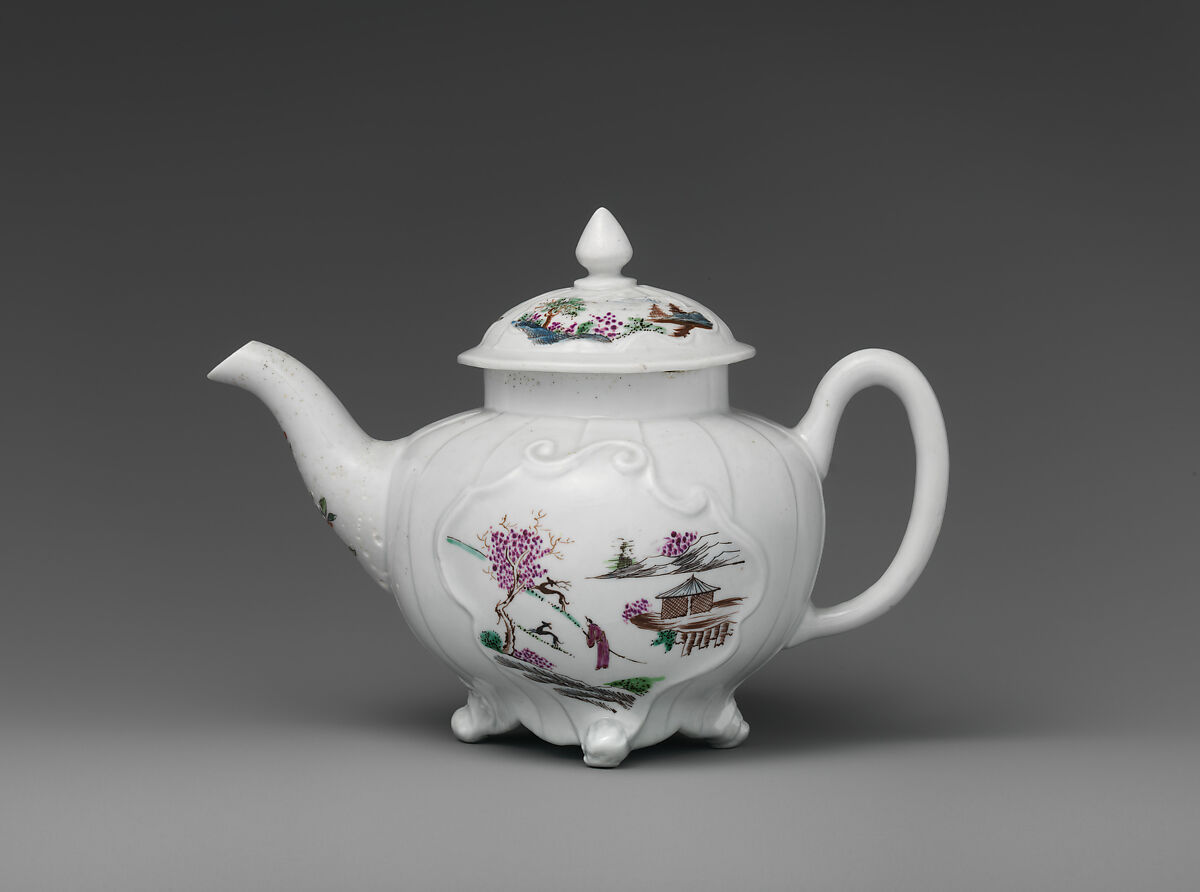 This Worcester teapot features an Asian-inspired chinoiserie scene, and scrolling molded decoration in the European rococo style. The blending of chinoiserie with rococo was not uncommon for mid-18th century British porcelain as both styles were characterized by a sense of fantasy and asymmetry.